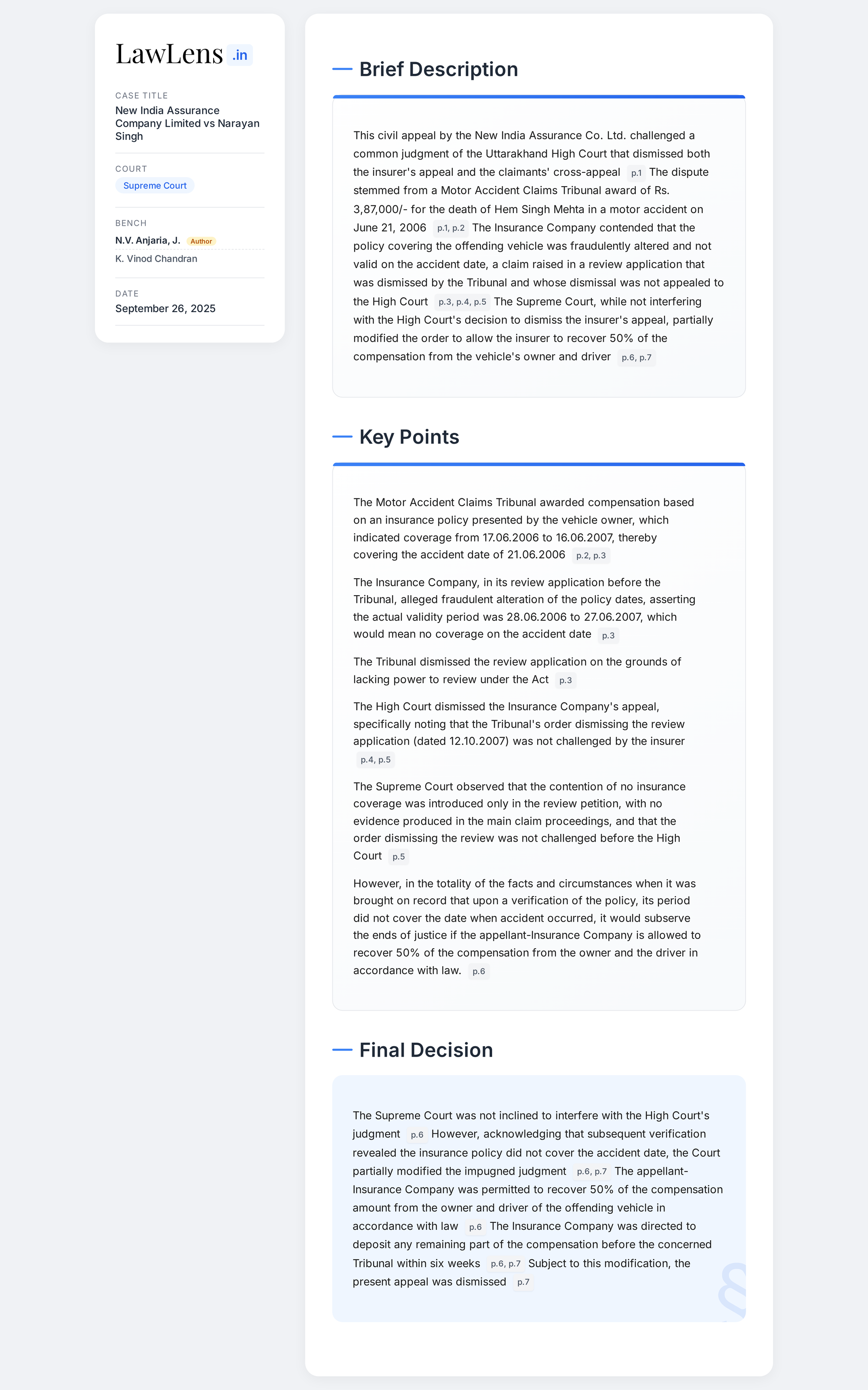 - Case name: New India Assurance Co. Ltd. v. Narayan Singh & Ors.