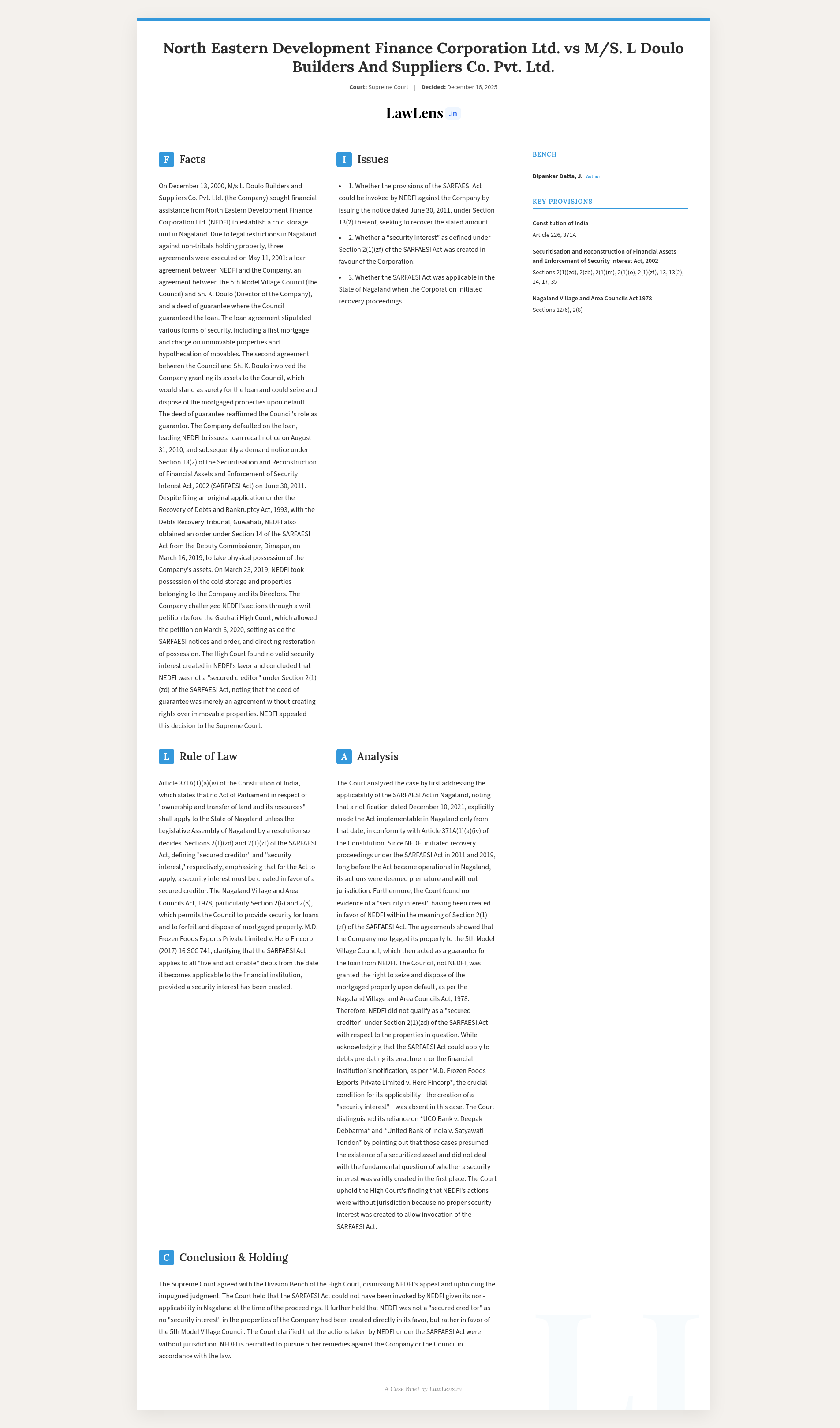 North Eastern Development Finance Corporation Ltd. v. L. Doulo Builders and Suppliers Co. Pvt. Ltd., 2025 INSC 1446 - SARFAESI Act vs Constitutional Provisions