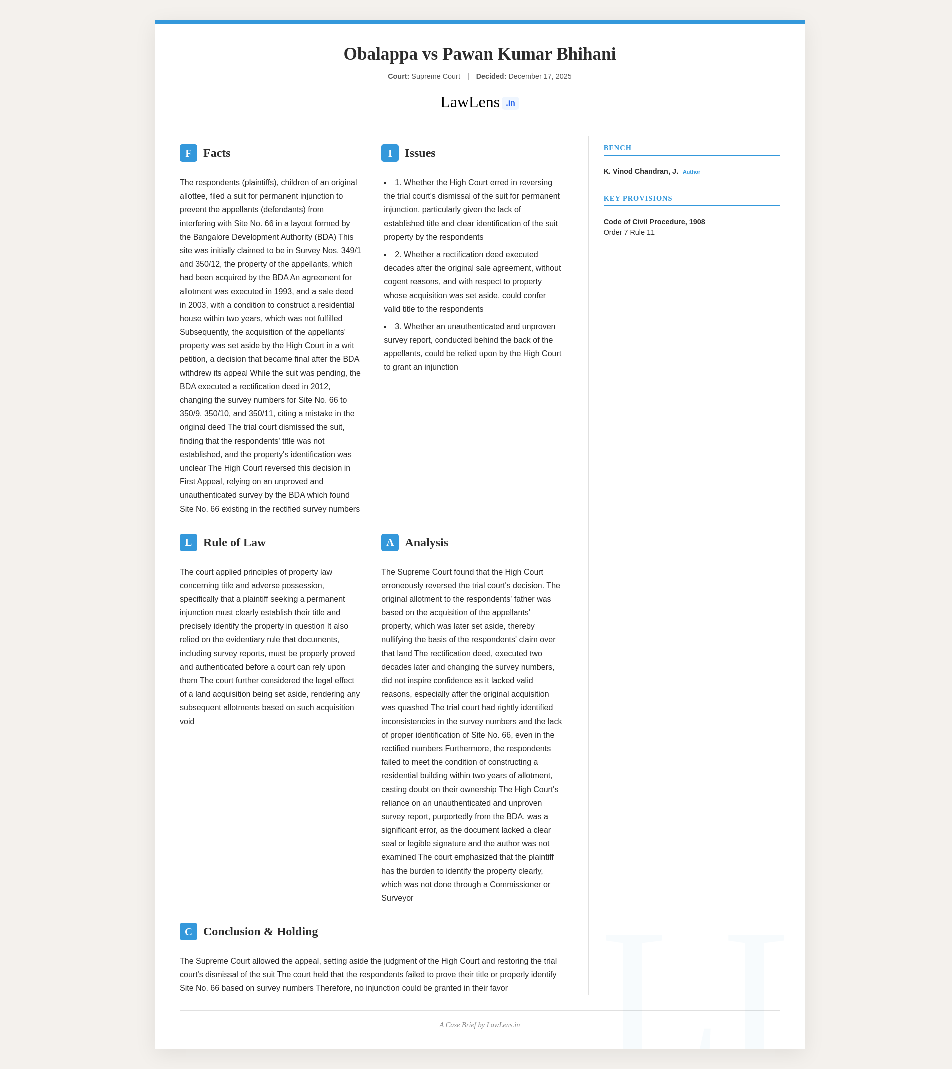 Obalappa vs Pawan Kumar Bhihani 2025 INSC 1450 - Injunction Suit - Identification Of Suit Property