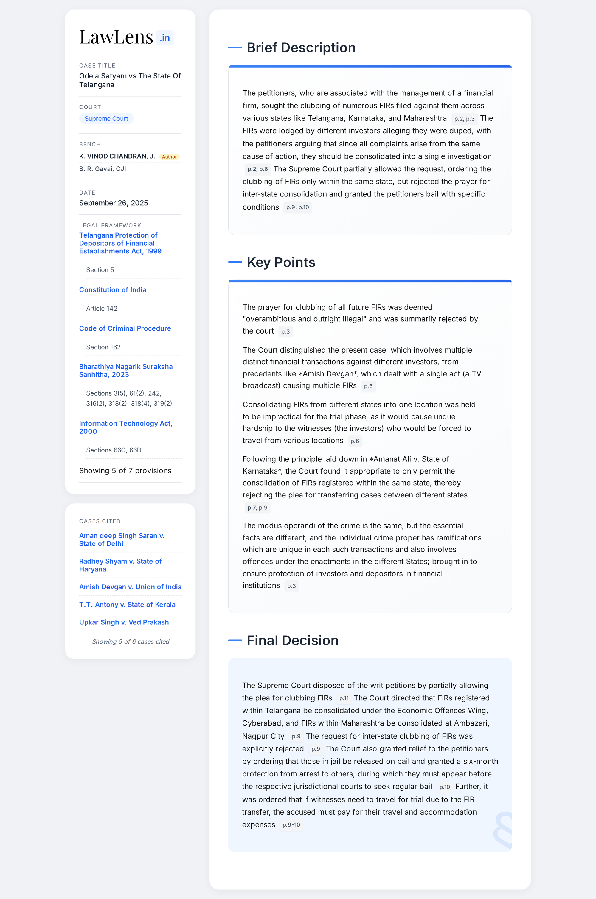 Odela Satyam vs State of Telangana 2025 INSC 1174 - Clubbing Of FIRs