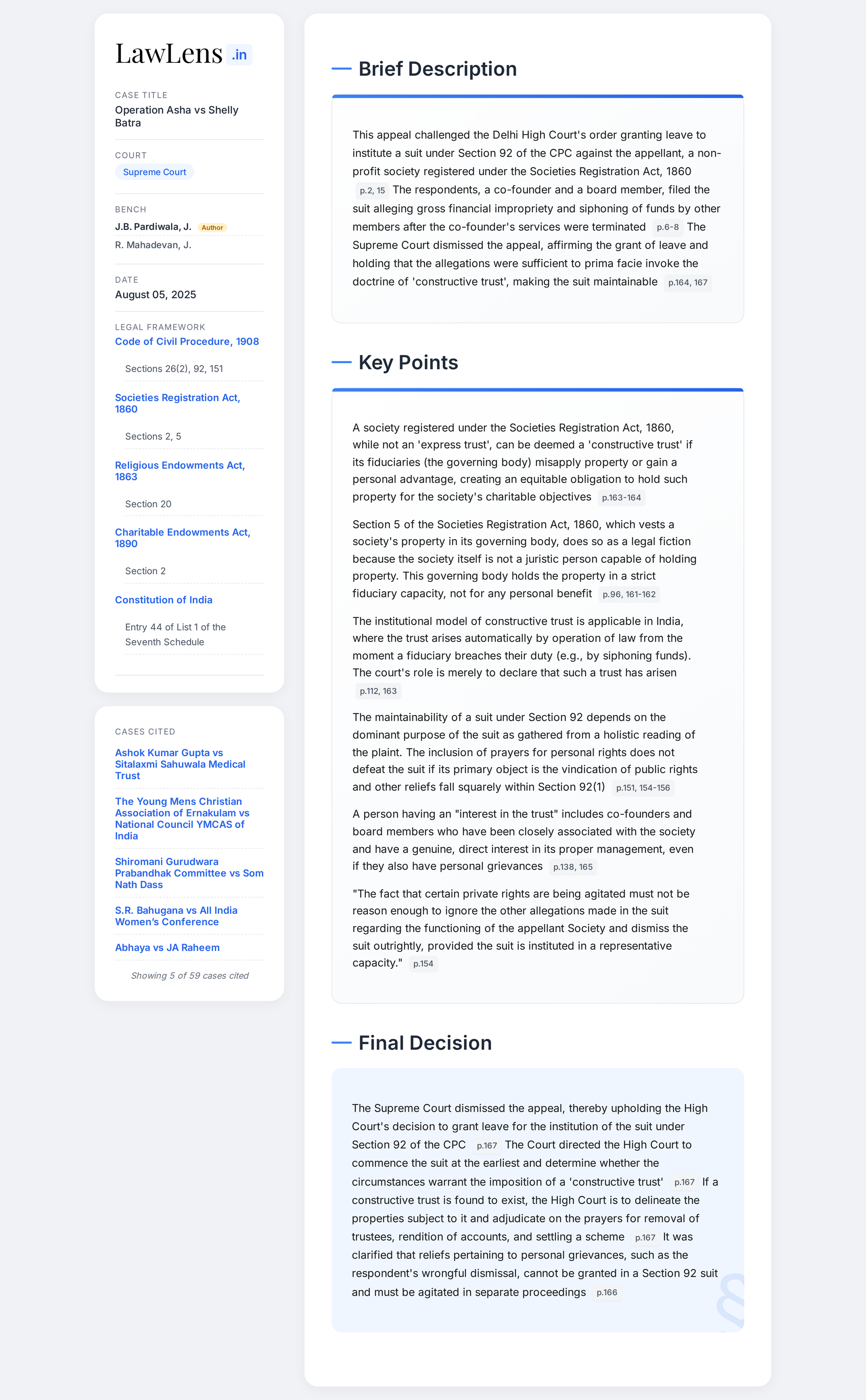 Code of Civil Procedure 1908 - Section 92- i. A suit under Section 92 of the CPC is a representative suit of a special nature since the action is instituted on behalf of the public beneficiaries and in public interest. Obtaining a ‘grant of leave’ from the court before the suit can be proceeded with, acts as a procedural and legislative safeguard in order to prevent public trusts from being subjected to undue harassment through frivolous suits being filed against them and also to obviate a situation that would cause a further wastage of resources which can otherwise be put towards public charitable or religious aims. However, at the stage of grant of leave, the court neither adjudicates upon the merits of the dispute nor confers any substantive rights upon the parties- Conditions or essential pre-requisites that need to be fulfilled for a suit to be maintainable (a) the trust in question must be created for public purposes of a charitable or religious nature; (b) there must exist a breach of trust or a direction of the court must be necessary for the administration of the trust; and (c) the relief claimed must be one or other of the reliefs as enumerated under Section 92(1) of the CPC. In order to successfully establish that a suit is not maintainable under Section 92, it would be sufficient to prove that any one of the conditions enumerated above has not been met, however, in order to assert its maintainability, all the aforesaid conditions need to be satisfied- iii. A trust can be said to have been created for a ‘public purpose’ when the beneficiaries are the general public who are incapable of exact ascertainment. Even if the beneficiaries are not necessarily the public at large, they must at least be a classified section of it and not a pre-ascertained group of specific individuals. - iv. A crucial condition that needs satisfaction is whether the institution/ organisation in relation to which certain reliefs are sought can in fact be considered to be a ‘trust’ or a ‘constructive trust’. v. When no formal recognition has been given to the institution, the creation of a public trust can be inferred from the relevant circumstances surrounding the coming into existence of and functioning of the institution/entity in question. Although it is not possible to provide an exhaustive list of the same, yet they may include – (a) the method of devolution of the property to the institution or its acquisition and the circumstances along with the intention behind the grant of property i.e. whether it was for the benefit of the organization/public beneficiaries or for the personal benefit of any particular individual/family; (b) whether the grant is accompanied with any fetter/obligation or qualified with a condition, either express or implied, regarding its use by the grantee; (c) whether the ‘dedication’ was complete i.e., whether there was an absolute cessation or complete relinquishment of ownership of the property on the part of the grantor and a subsequent vesting of the property in another individual (trustee) for the said object; (d) whether the public user or an unascertained class of individuals could exercise any ‘right’ over the organization and its Page No. 160 of 167 properties; (e) the manner of use of the profits accrued, more particularly, whether it is applied/re-applied towards the benefit of the organization and its objectives, etc. vi. If the aforementioned circumstances exist and the entity has been, much later in time, registered as a society under the Societies Registration Act, 1860, it would still be treated as a ‘public trust’ - The mere factum of registration of a society under the Societies Registration Act, 1860, after it attained the characteristics of a public trust, could not change the character of the properties which had already been constituted as trust properties. vii. However, if the institution has been registered, from its inception, as a society under the Societies Registration Act, 1860, it is true that whenever a society acquires property, it cannot be said that it declares itself a trustee in respect of said property. In other words, the effect of registration under the Societies Registration Act, 1860 would not be to automatically invest the properties of the society with the character of trust property.(Para 137)