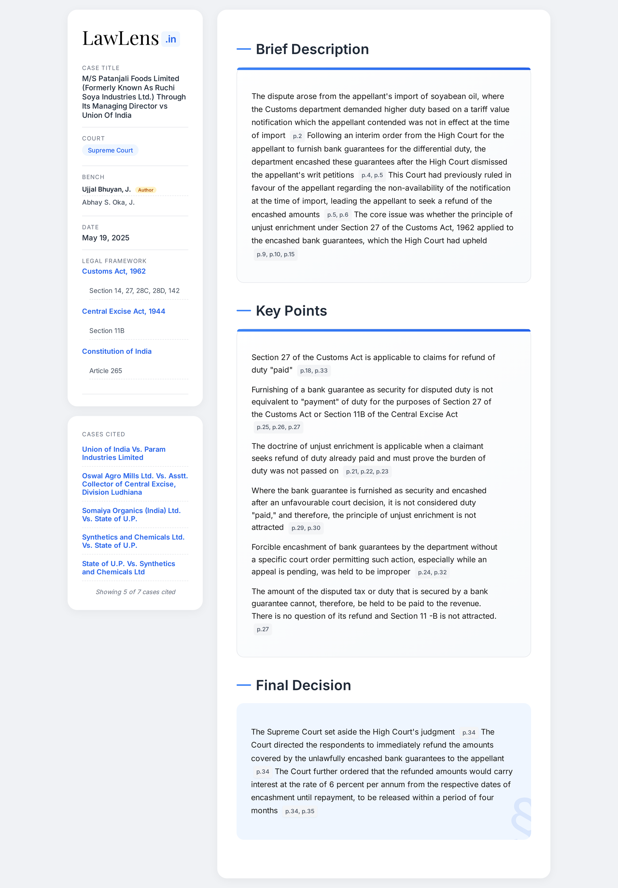 Patanjali Foods Limited vs Union Of India 2025 INSC 733- Section 27 Customs Act - Unjust Enrichment Doctrine - Bank Guarantee