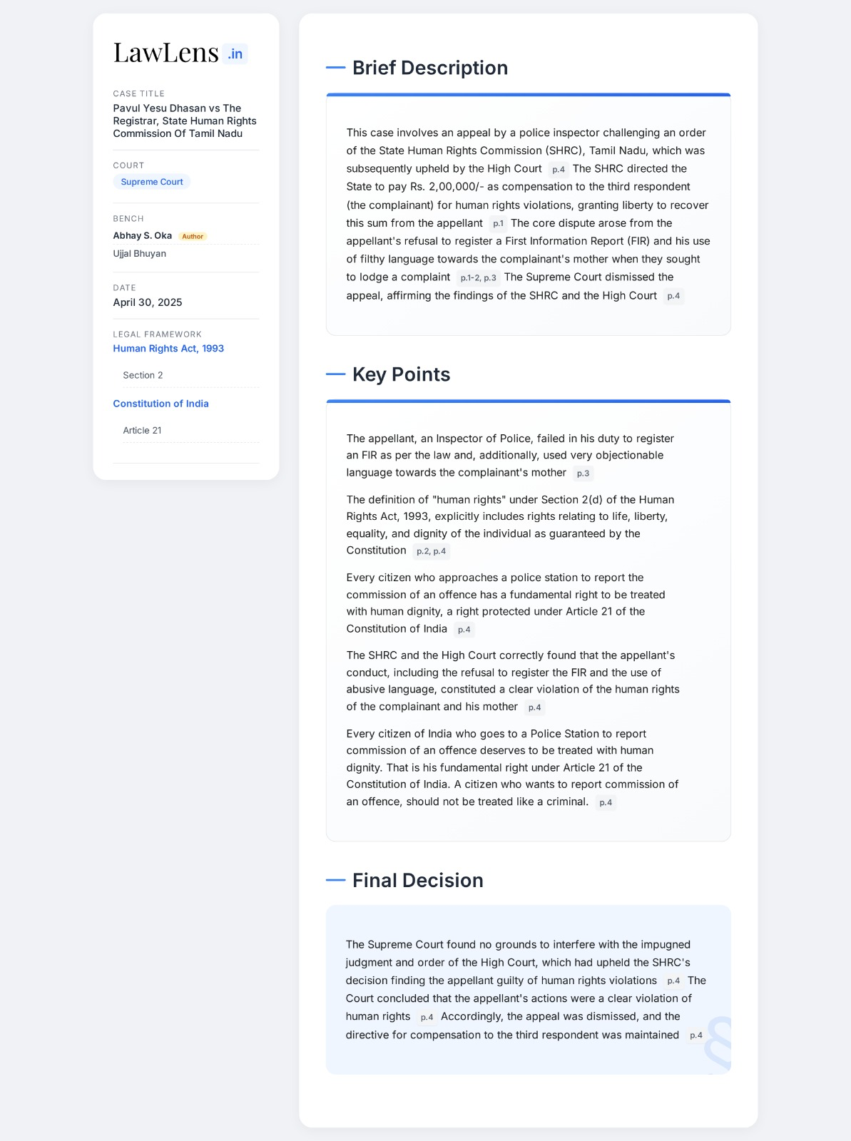 Constitution of India - Article 21 ; Human Rights Act 1993 - Section 2(d) - Every citizen of India who goes to a Police Station to report commission of an offence deserves to be treated with human dignity. That is his fundamental right under Article 21 of the Constitution of India. A citizen who wants to report commission of an offence, should not be treated like a criminal. [Context: SC upheld the findings of Human Rights Commission that there was a violation of human rights in this case ]