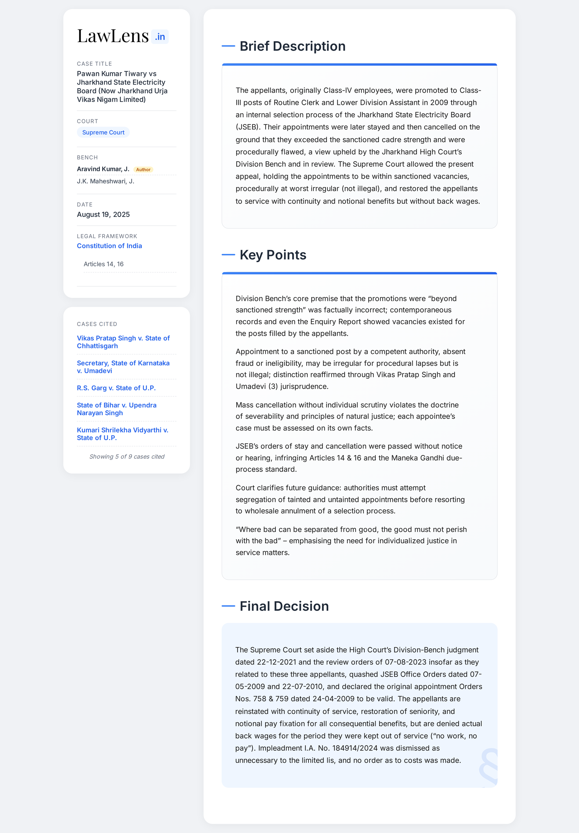 - Case Name: Pawan Kumar Tiwary and Others v. Jharkhand State Electricity Board (now Jharkhand Urja Vikas Nigam Limited) and Others