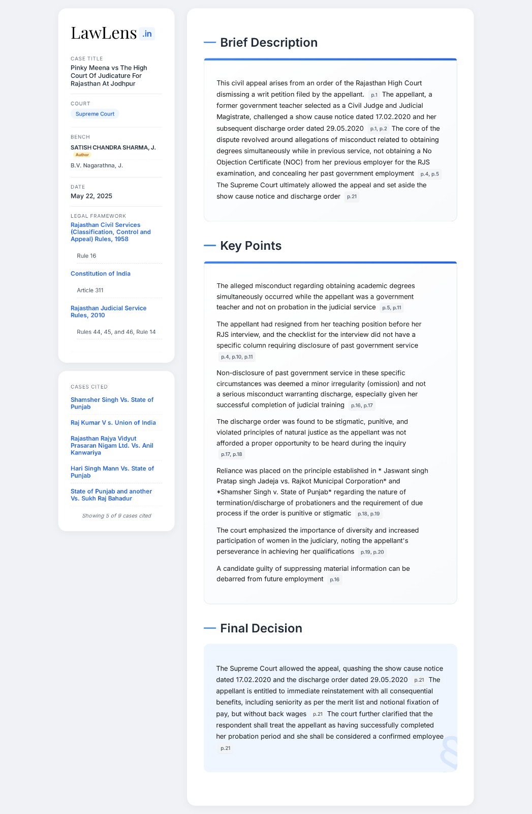 Pinky Meena vs High Court Of Judicature For Rajasthan 2025 INSC 756 - Women in Judiciary - Probationer Rights
