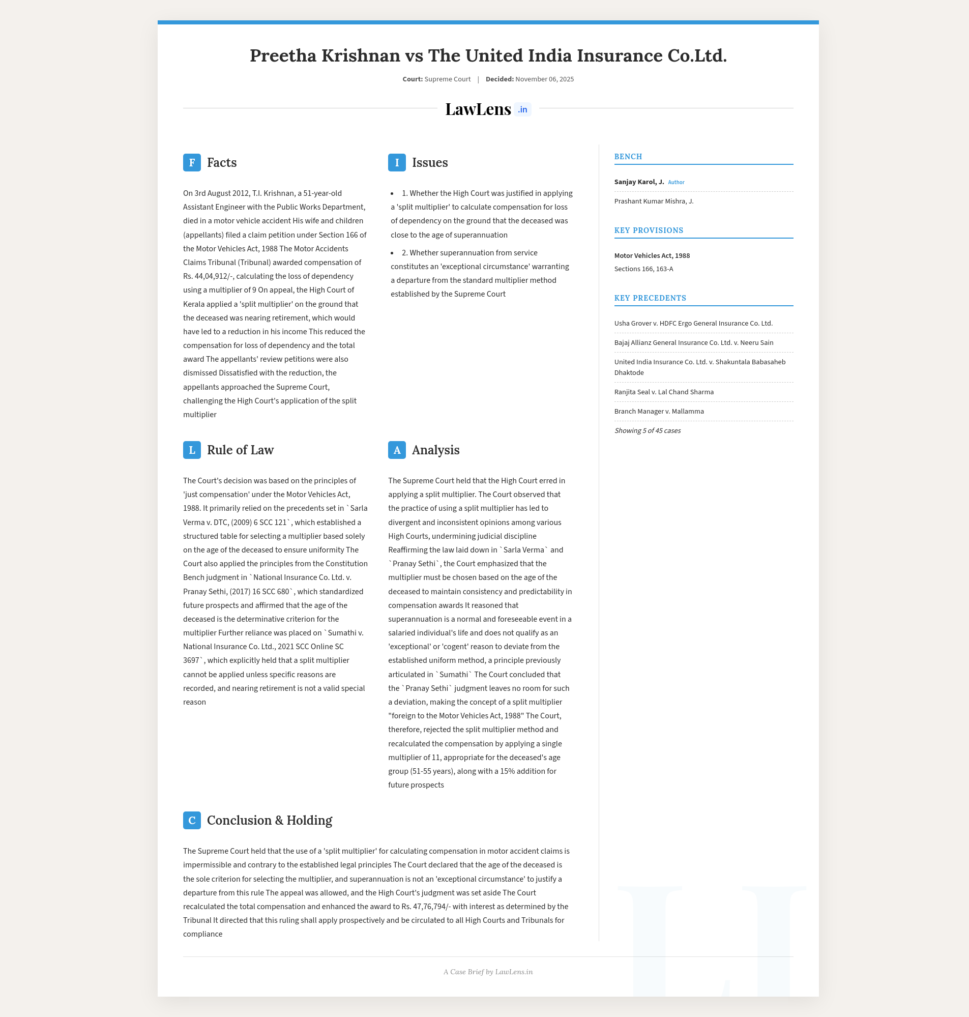 Preetha Krishnan vs United India Insurance Co. Ltd.; 2025 INSC 1293 - Motor Accident Compensation- Split Multiplier