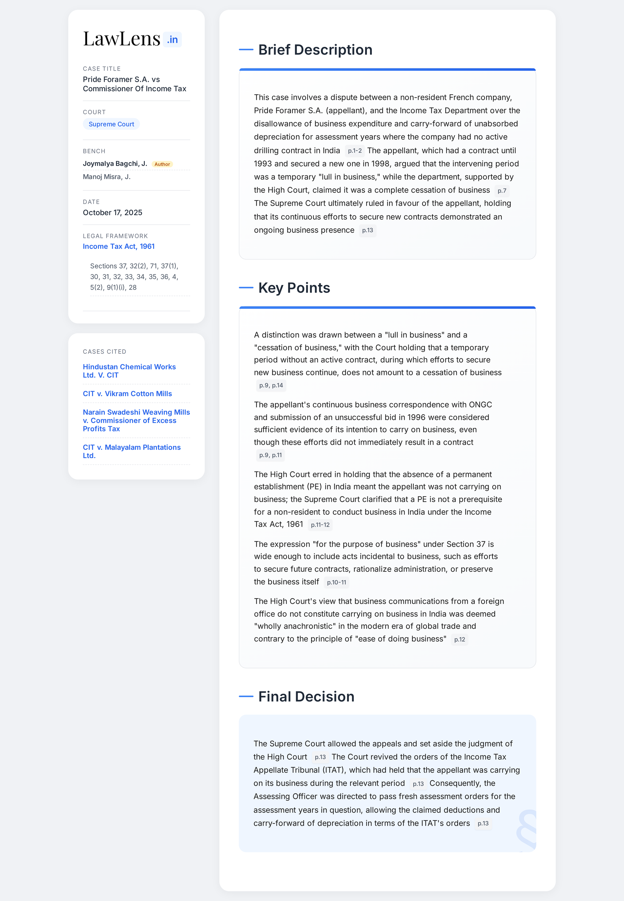 - Case name: Pride Foramer S.A. vs Commissioner of Income Tax & Anr.