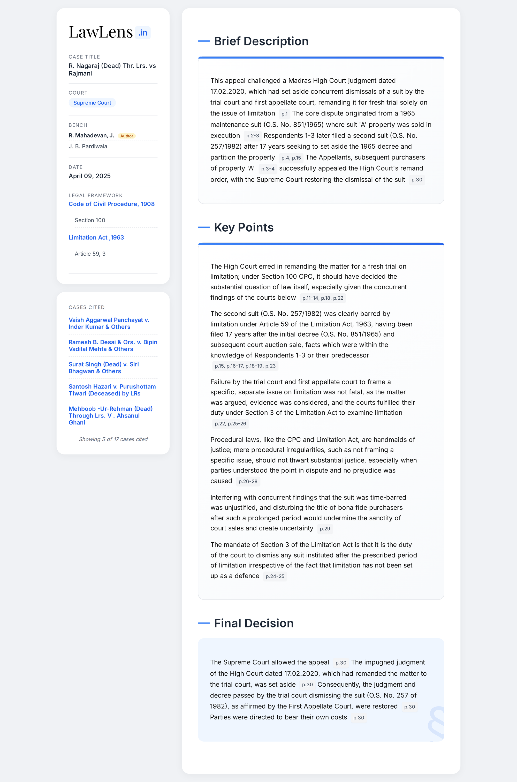 R. Nagaraj (D) vs Rajmani 2025 INSC 478 - CPC - Framing of Issues - Limitation
