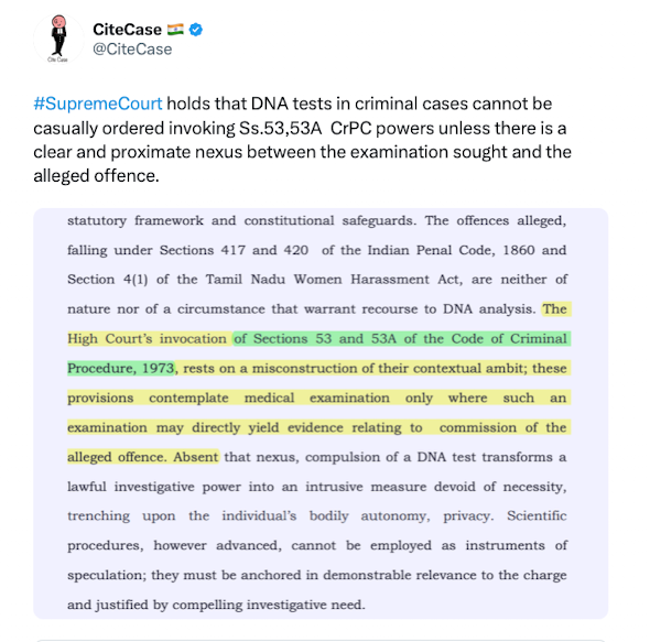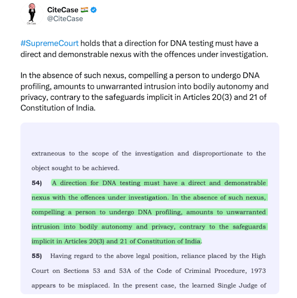 In the absence of such nexus, compelling a person to undergo DNA profiling, amounts to unwarranted intrusion into bodily autonomy and privacy,… https://t.co/YnjBDP2GPu pic.twitter.com/wRPiuAYpct