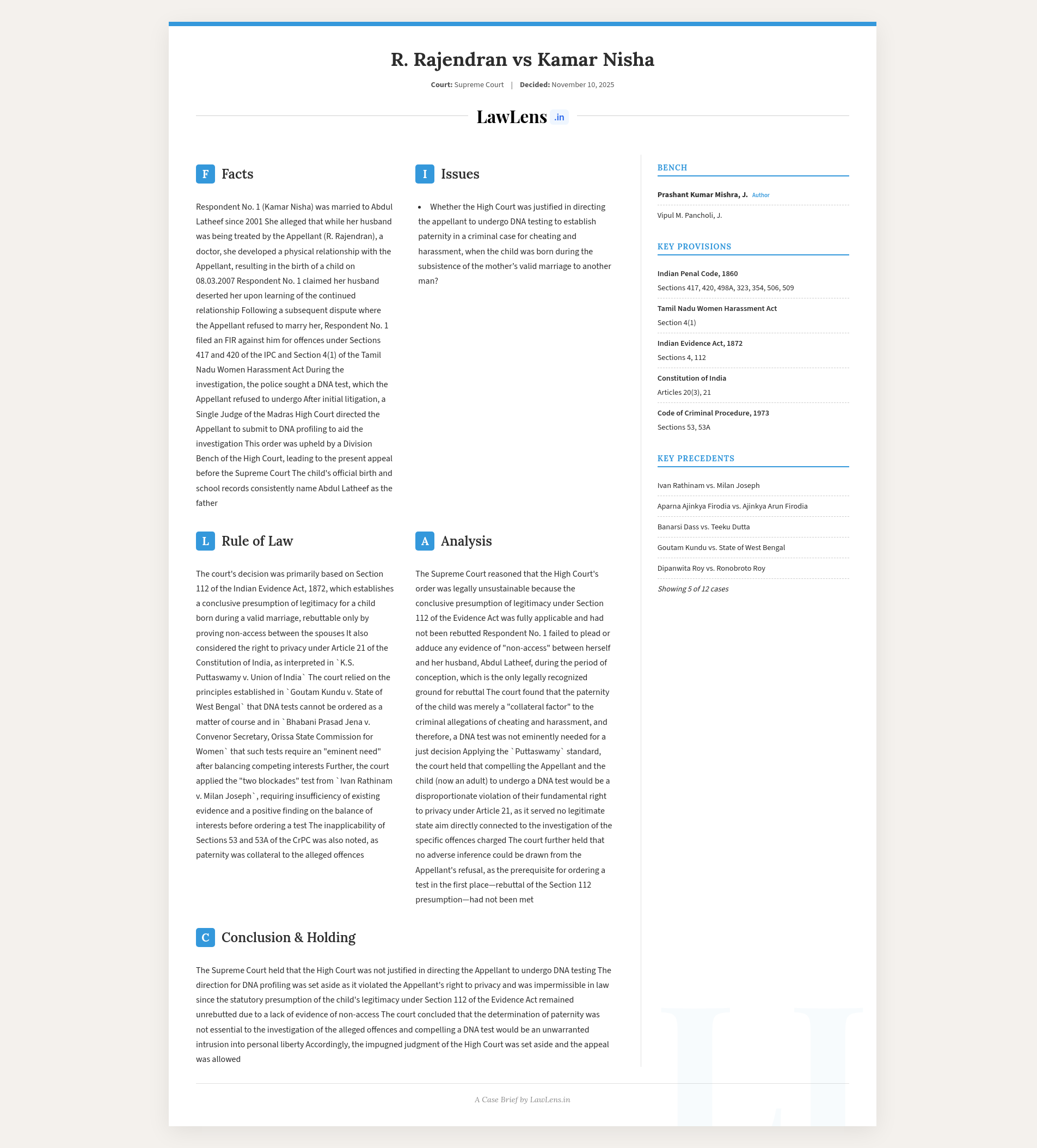R. Rajendran v. Kamar Nisha 2025 INSC 1304 - S.112 Evidence Act - Presumption - Child Legitimacy