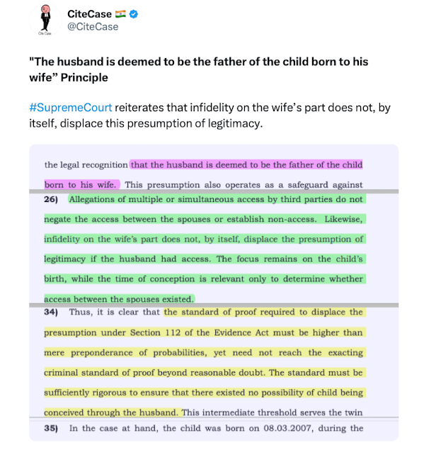 "The husband is deemed to be the father of the child born to his wife” Principle#SupremeCourt reiterates that infidelity on the wife’s part does not, by itself, displace this presumption of legitimacy. https://t.co/YnjBDP2GPu pic.twitter.com/bpDvDSpJHs
