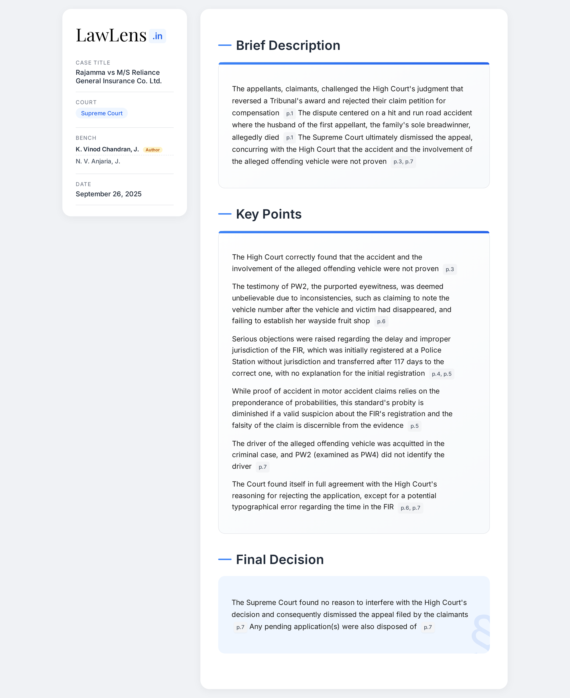 Rajamma vs Reliance General Insurance Co. Ltd. 2025 INSC 1176 - Motor Accident Compensation - FIR - Proof Of Accident
