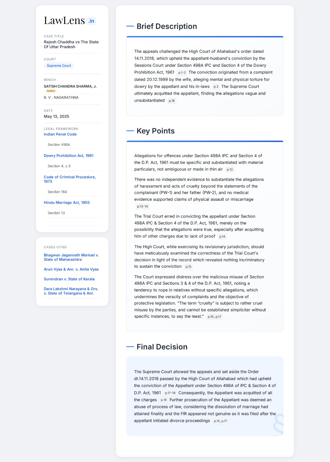 Indian Penal Code 1860 - Section 498A ; Dowry Prohibition Act - Sections 3,4- In order to meet the threshold of the offences under Section 498A IPC & Sections 3 & 4 of the D.P. Act, 1961, the allegations cannot be ambiguous or made in thin air (Para 8)- A cursory or plausible view cannot be conclusive proof to determine the guilt of an individual under Section 498A & Section 4 of the D.P. Act (Para 11)- The term “cruelty” is subject to rather cruel misuse by the parties, and cannot be established simpliciter without specific instances, to say the least. The tendency of roping these sections, without mentioning any specific dates, time or incident, weakens the case of the prosecutions, and casts serious suspicion on the viability of the version of a Complainant (Para 14)- Growing tendency to append every relative of the husband, casts serious doubt on the veracity of the allegations made by the Complainant wife or her family members, and vitiates the very objective of a protective legislation. (Para 13)
