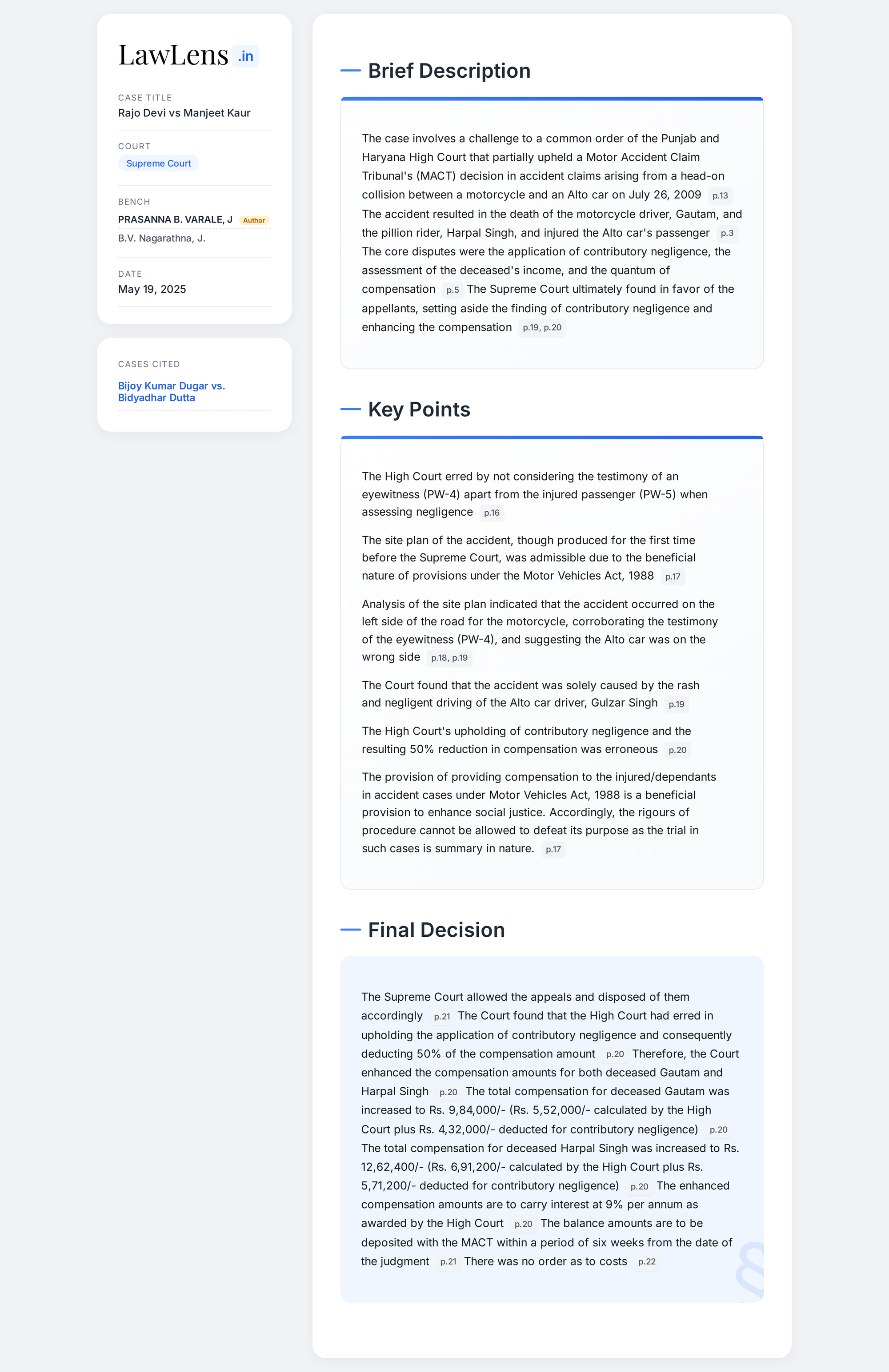 Motor Accident Compensation- The provision of providing compensation to the injured/dependants in accident cases under Motor Vehicles Act, 1988 is a beneficial provision to enhance social justice. Accordingly, the rigours of procedure cannot be allowed to defeat its purpose as the trial in such cases is summary in nature. (Para 18) [Context: SC relied on site plan produced before it and found that there was no contributory negligence on the part of deceased]