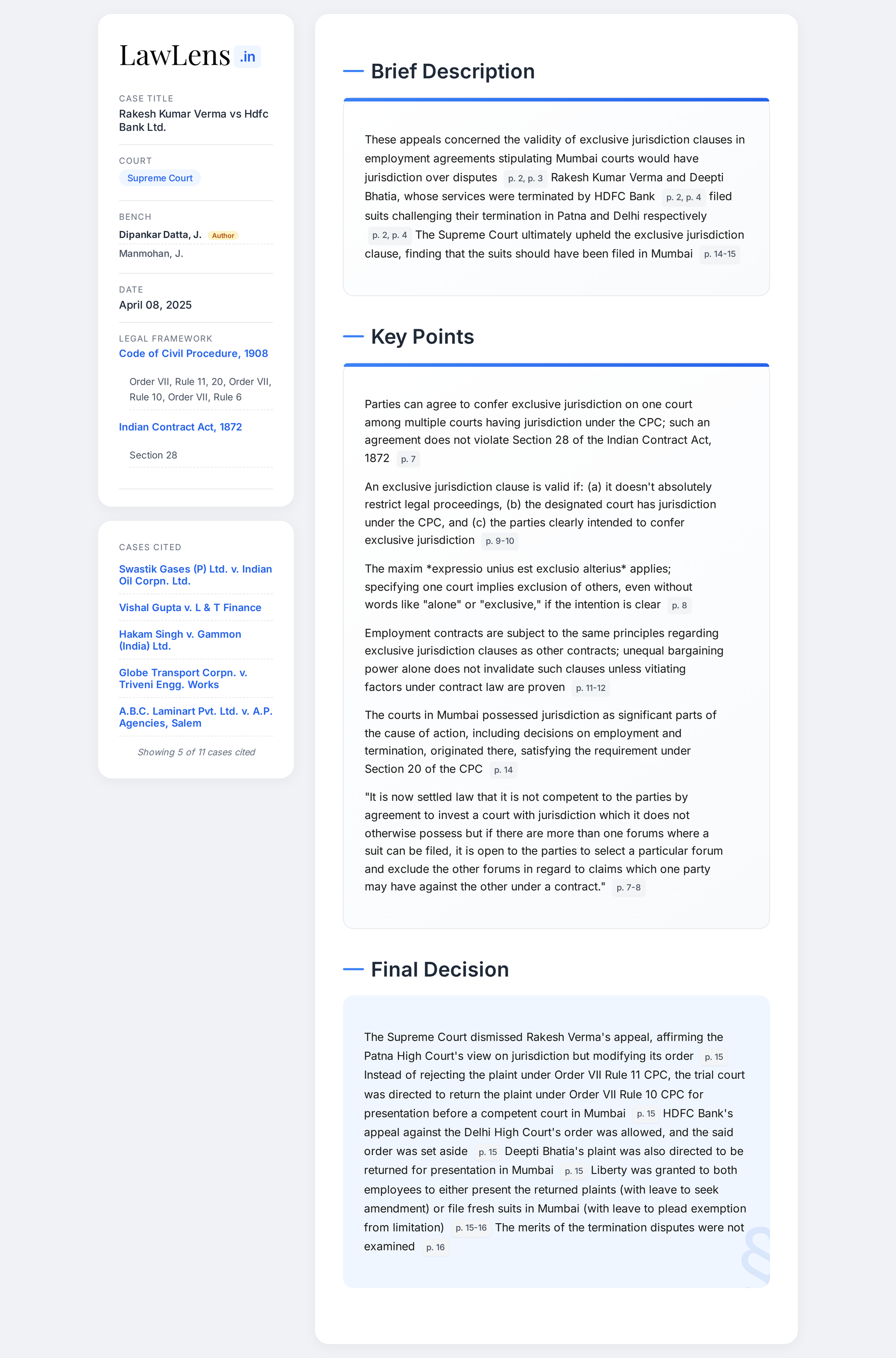 Rakesh Kumar Verma vs HDFC Bank Ltd. 2025 INSC 473 - Contract - Exclusive Jurisdiction Clauses