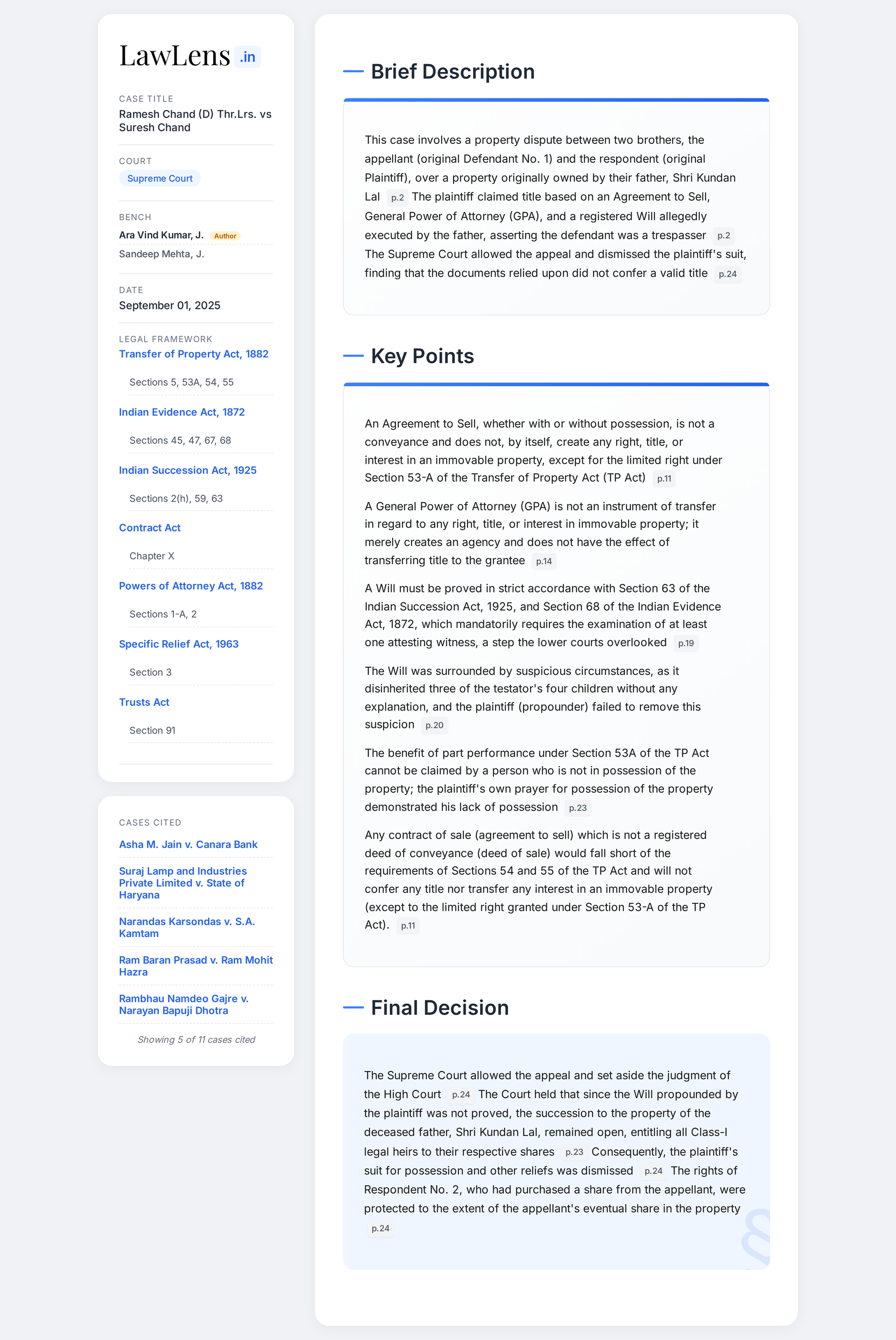 Ramesh Chand (D) vs Suresh Chand 2025 INSC 1059 - Ss. 53A, 54 TP Act - Will - Power Of Attorney - Agreement To Sell