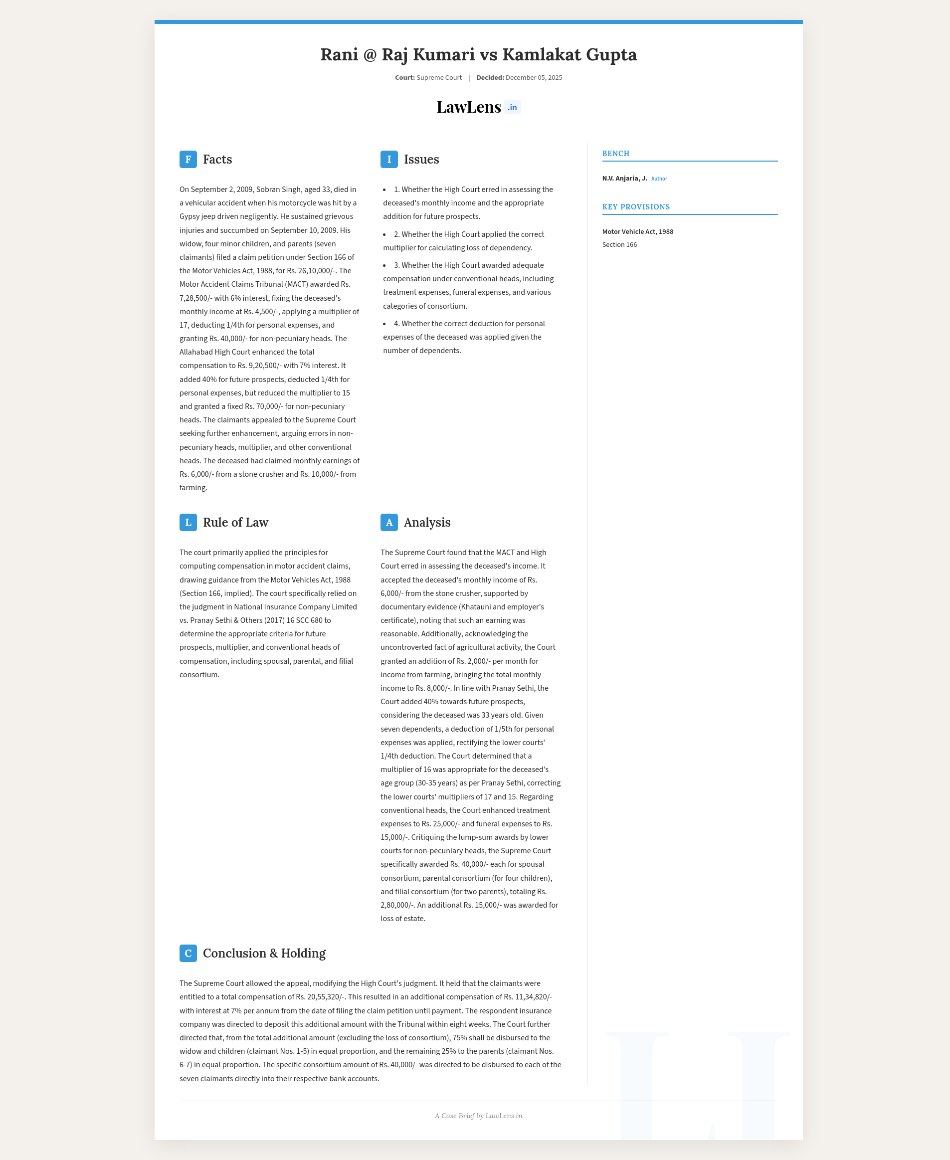 Rani @ Raj Kumari & Ors v. Kamlakat Gupta 2025 INSC 1393 -Motor Accident Compensation - Multiplier - Stone Crusher Employee