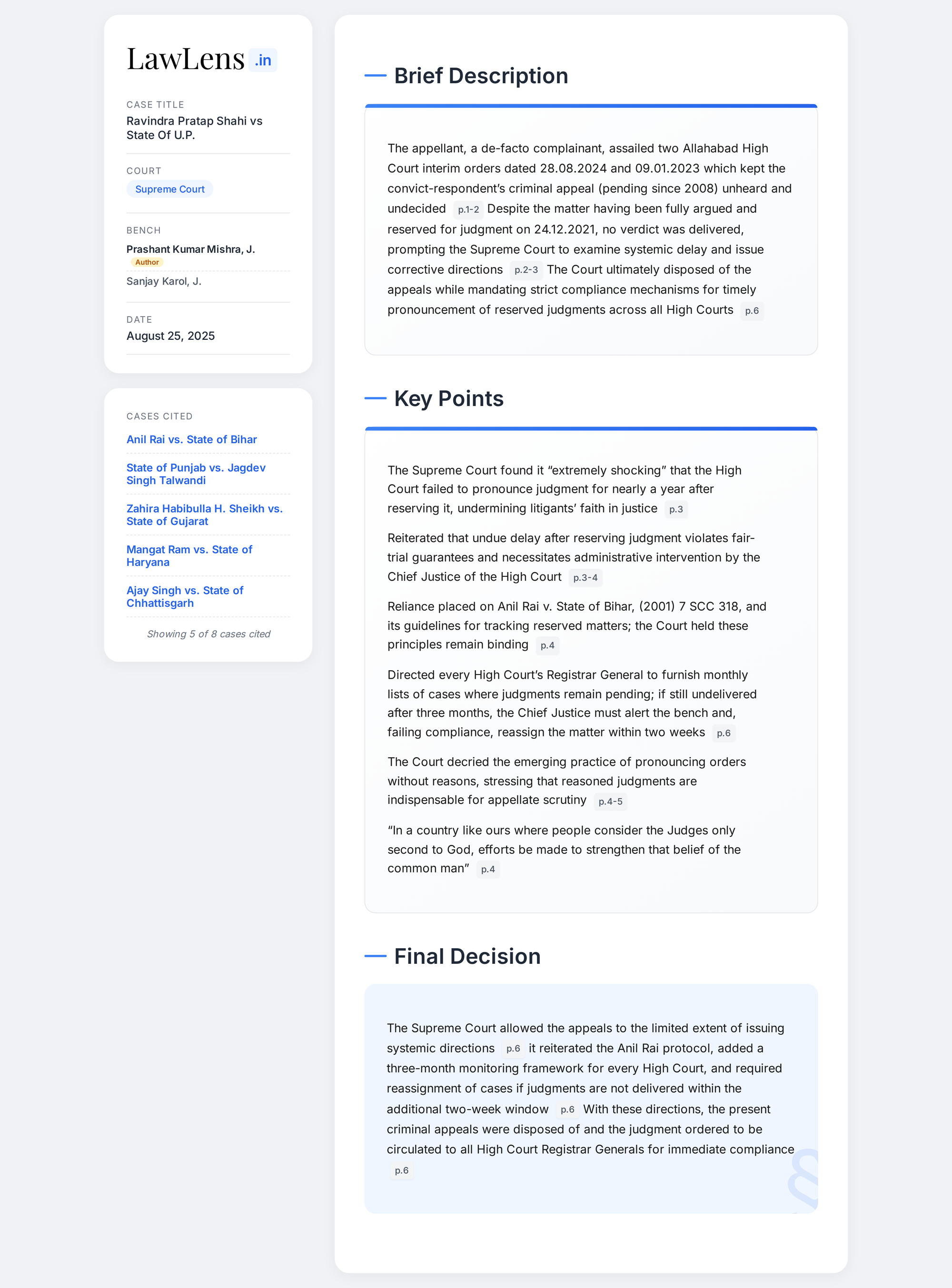 Ravindra Pratap Shahi v. State of U.P. 2025 INSC 1039 - Delay In Judgment Pronouncement