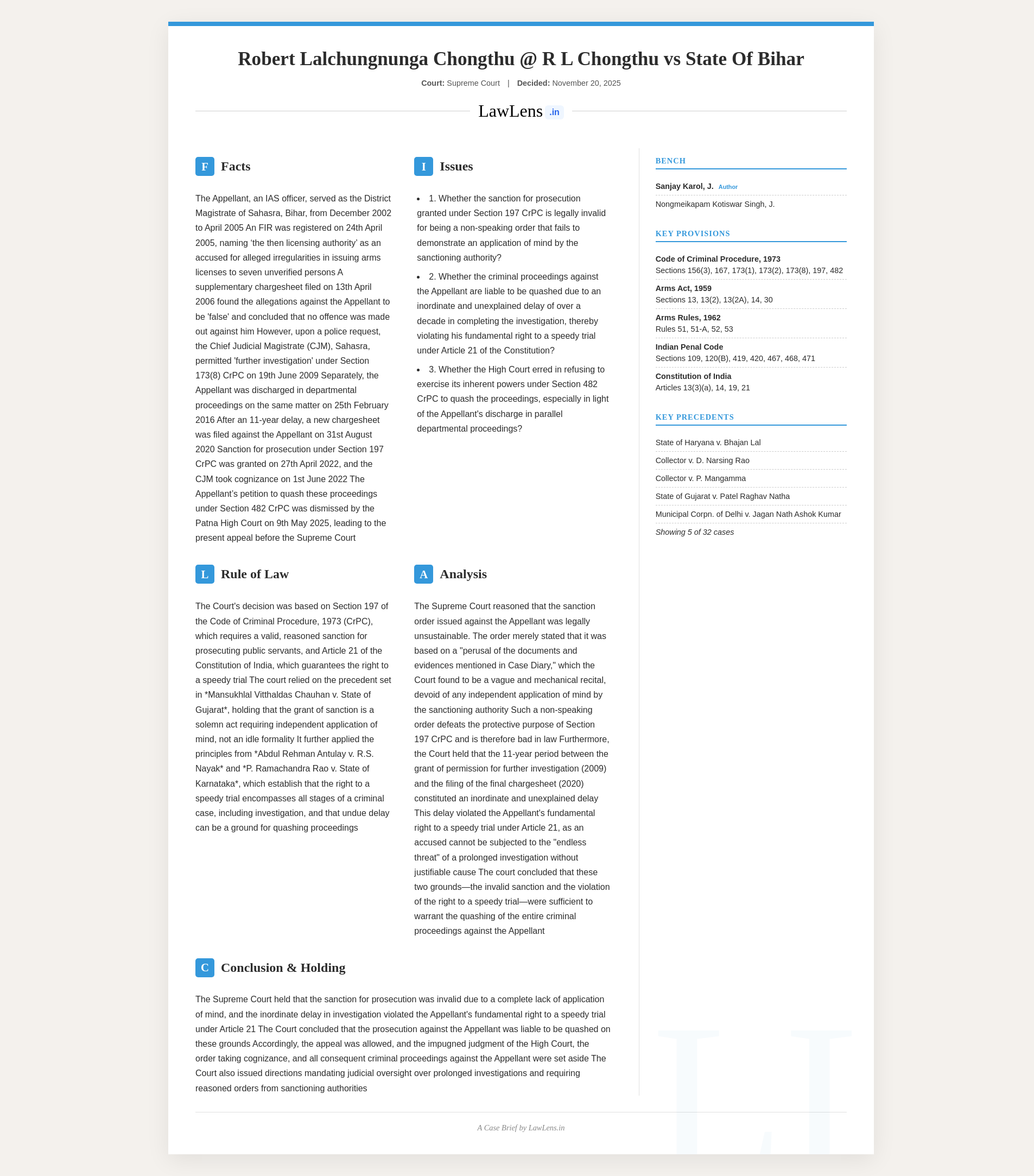 - Case name: Robert Lalchungnunga Chongthu @ R L Chongthu v. State of Bihar.