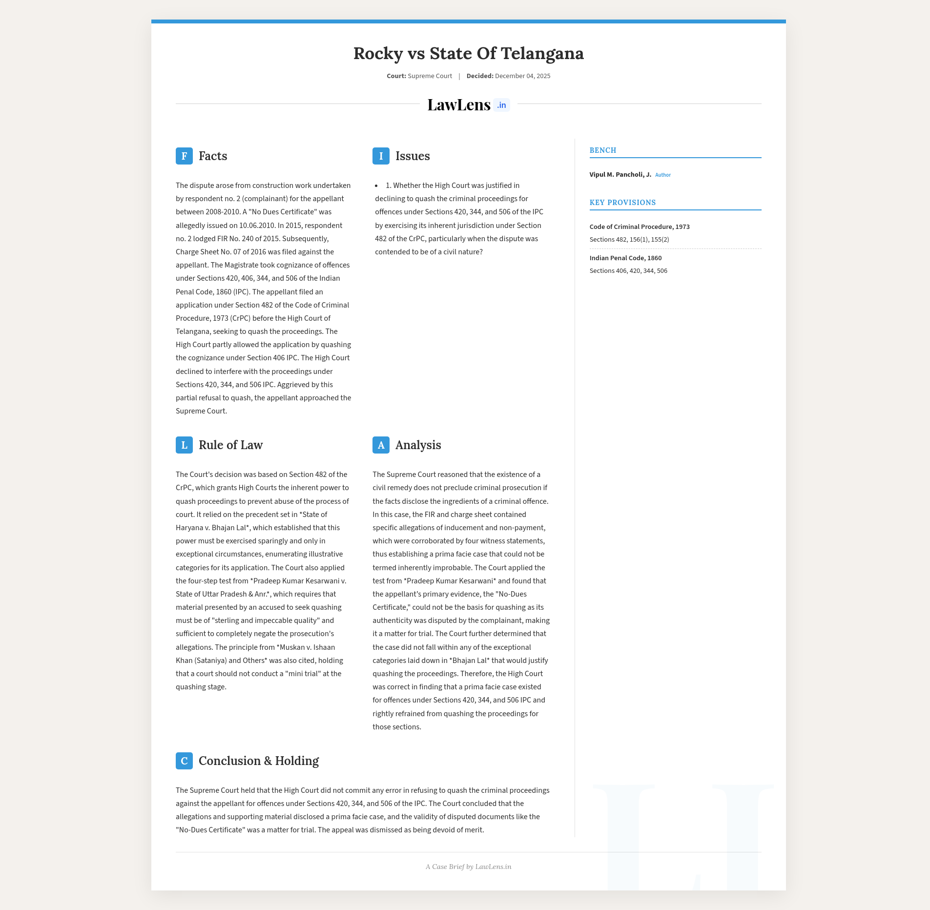 Rocky v. State of Telangana 2025 INSC 1384 - BNSS/CrPC - Quashing - Civil Nature