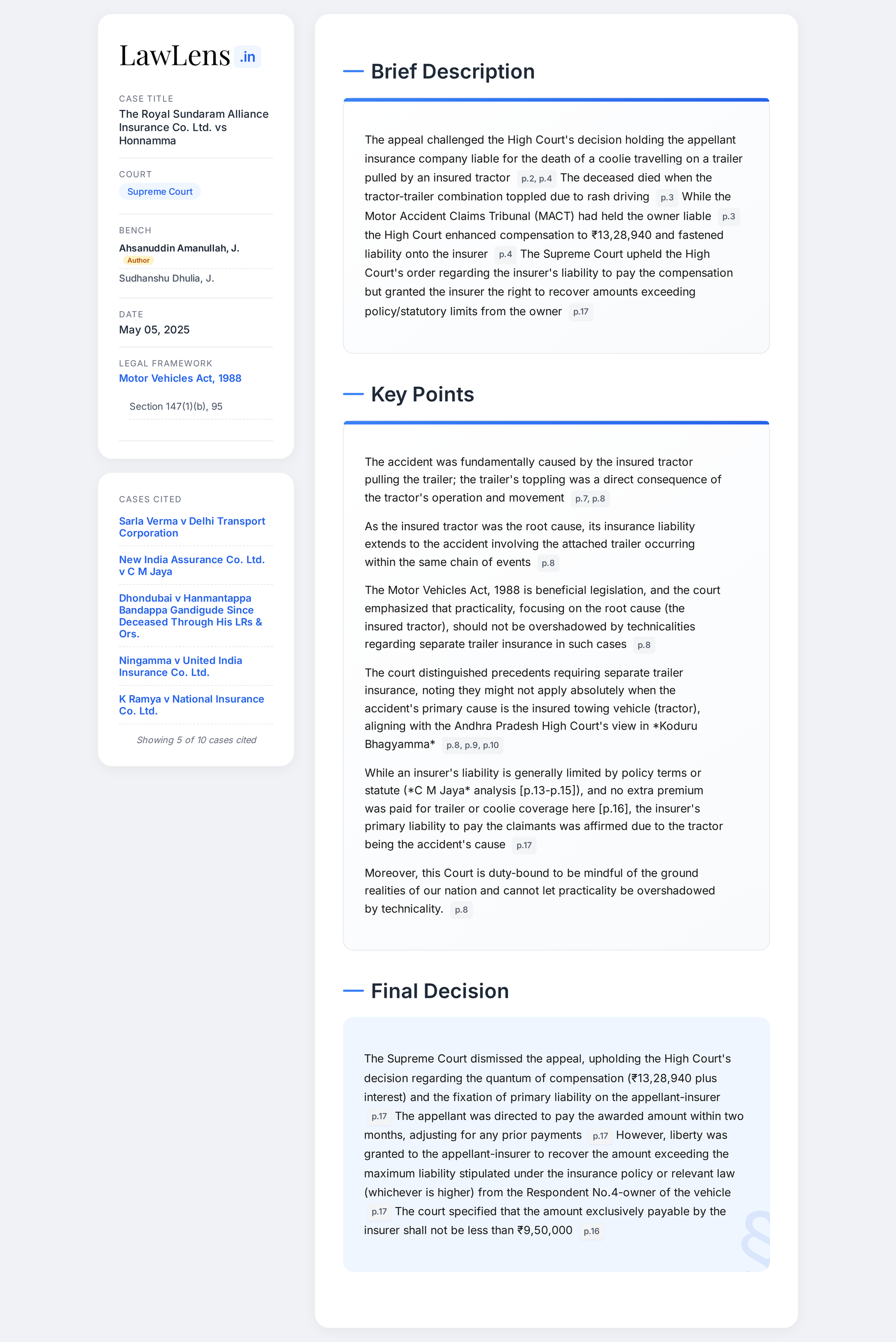 Royal Sundaram Alliance Insurance Co. Ltd. vs Honnamma 2025 INSC 625 -Motor Accident Compensation