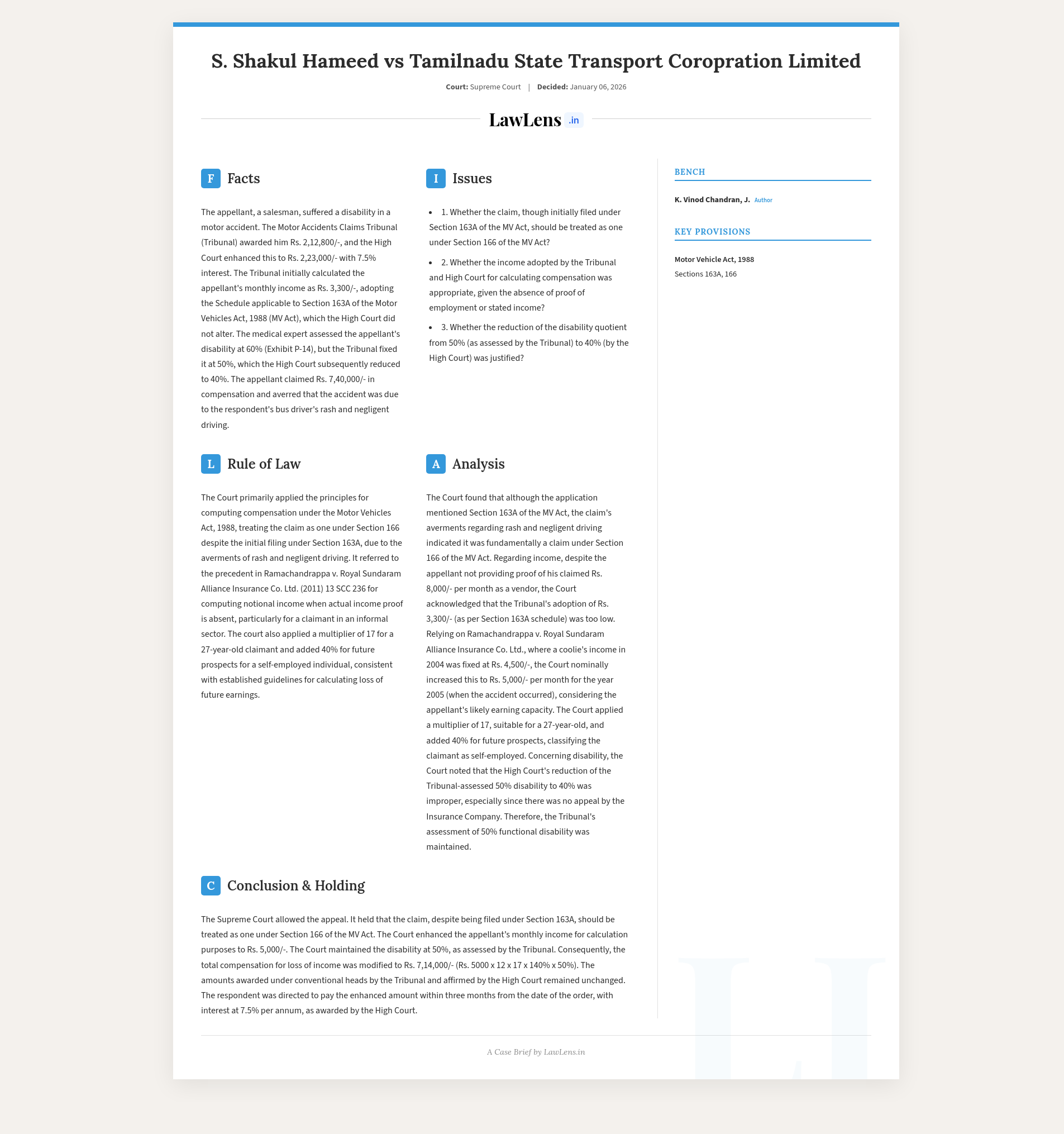 S. Shakul Hameed v. Tamil Nadu State Transport Corporation Ltd.; 2026 INSC 29 - Motor Accident Compensation