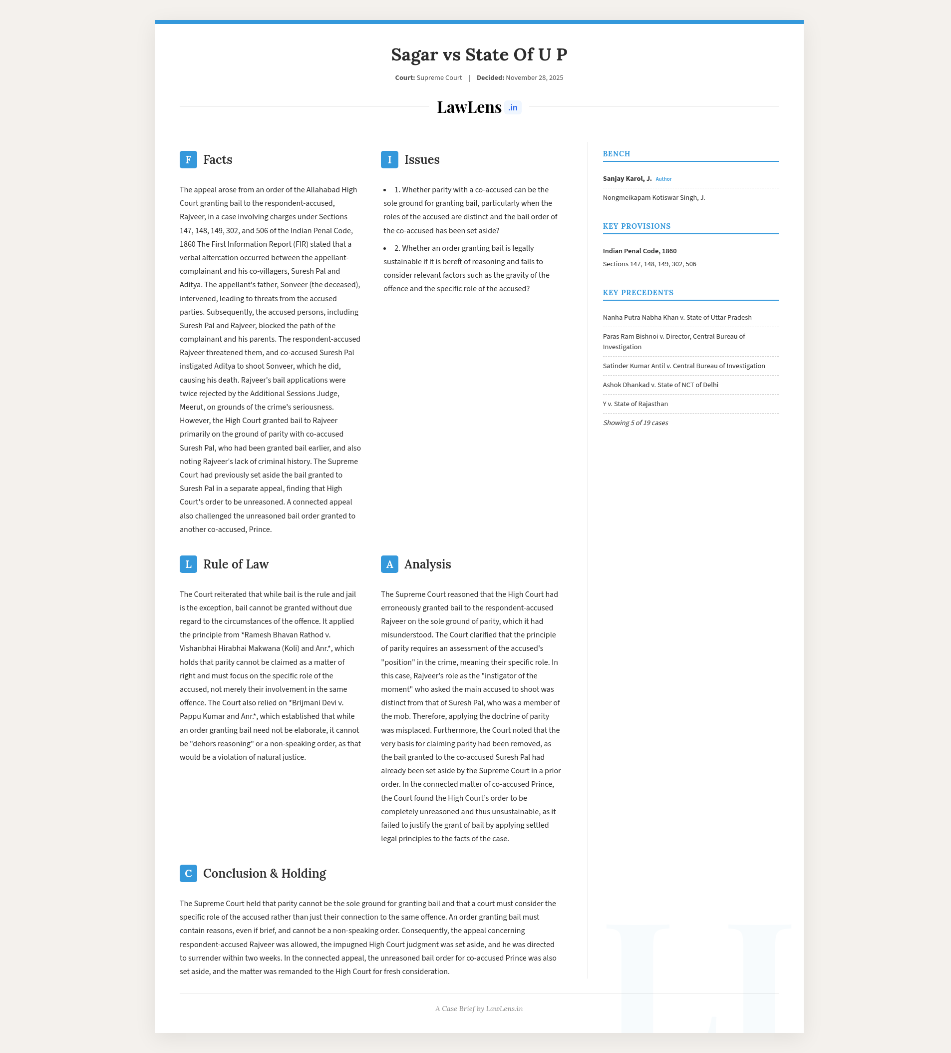 Sagar v. State of UP & Anr.; 2025 INSC 1370 - CrPC/BNSS -Bail - Parity Ground