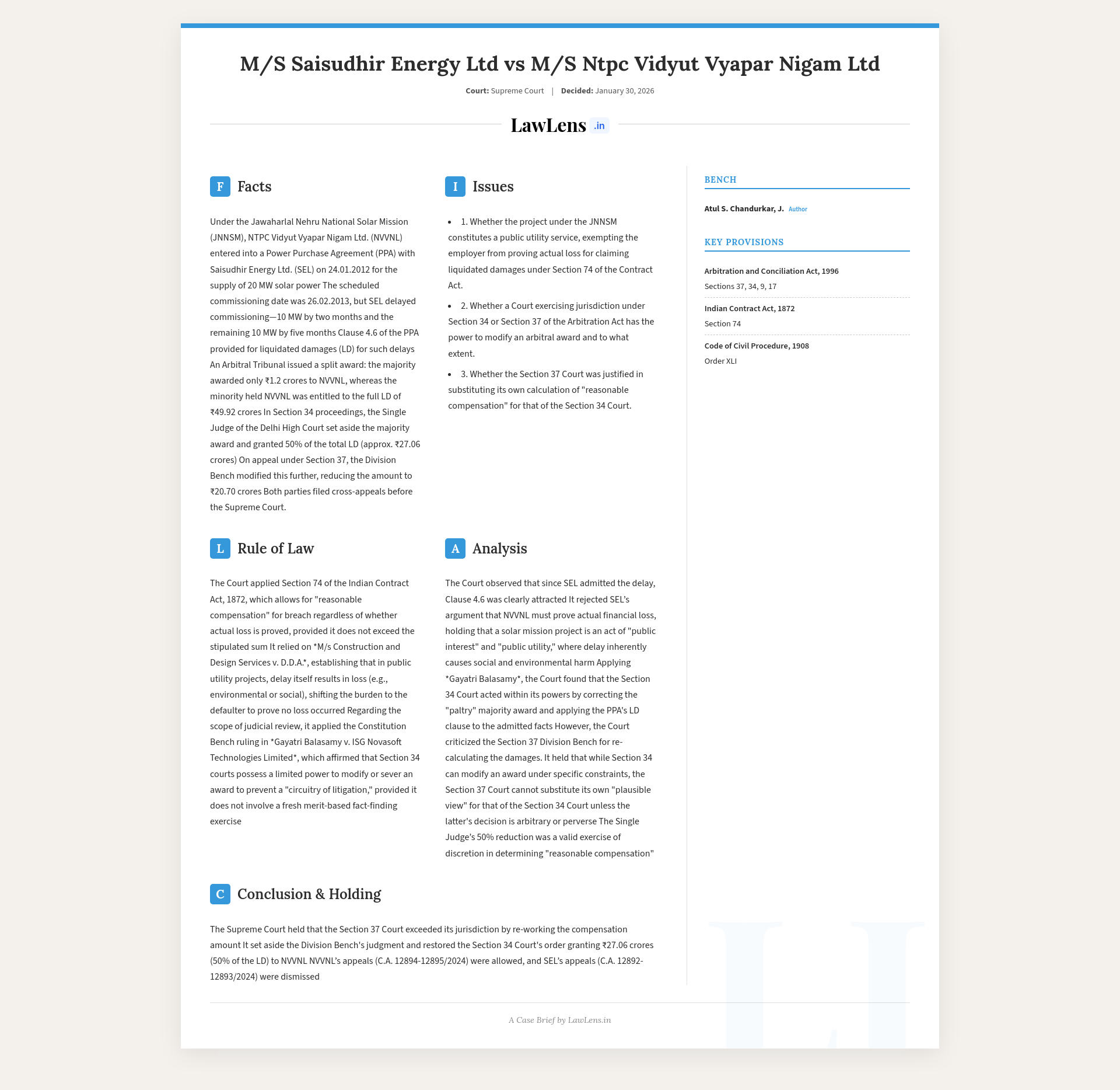 Statutes / laws referredArbitration and Conciliation Act, 1996 – Sections 9, 17, 34, 37;Indian Contract Act, 1872 – Section 74;Jawaharlal Nehru National Solar Mission (policy framework)Power Purchase Agreement between SEL and NVVNL – especially Clause 4.6 (liquidated damages) and Clause 11.5.1 (force majeure notice)