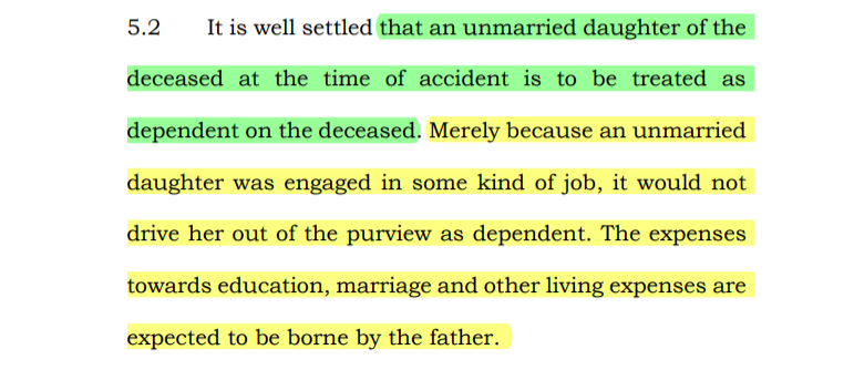 Motor Accident Compensation - Unmarried daughter of the deceased at the time of accident is to be treated as dependent on the deceased. Merely because an unmarried daughter was engaged in some kind of job, it would not drive her out of the purview as dependent. The expenses towards education, marriage and other living expenses are expected to be borne by the father. (Para 5.2)