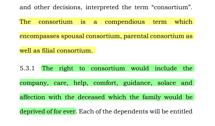Motor Accident Compensation - Consortium- The consortium is a compendious term which encompasses spousal consortium, parental consortium as well as filial consortium. - The right to consortium would include the company, care, help, comfort, guidance, solace and affection with the deceased which the family would be deprived of for ever. (Para 5.3)