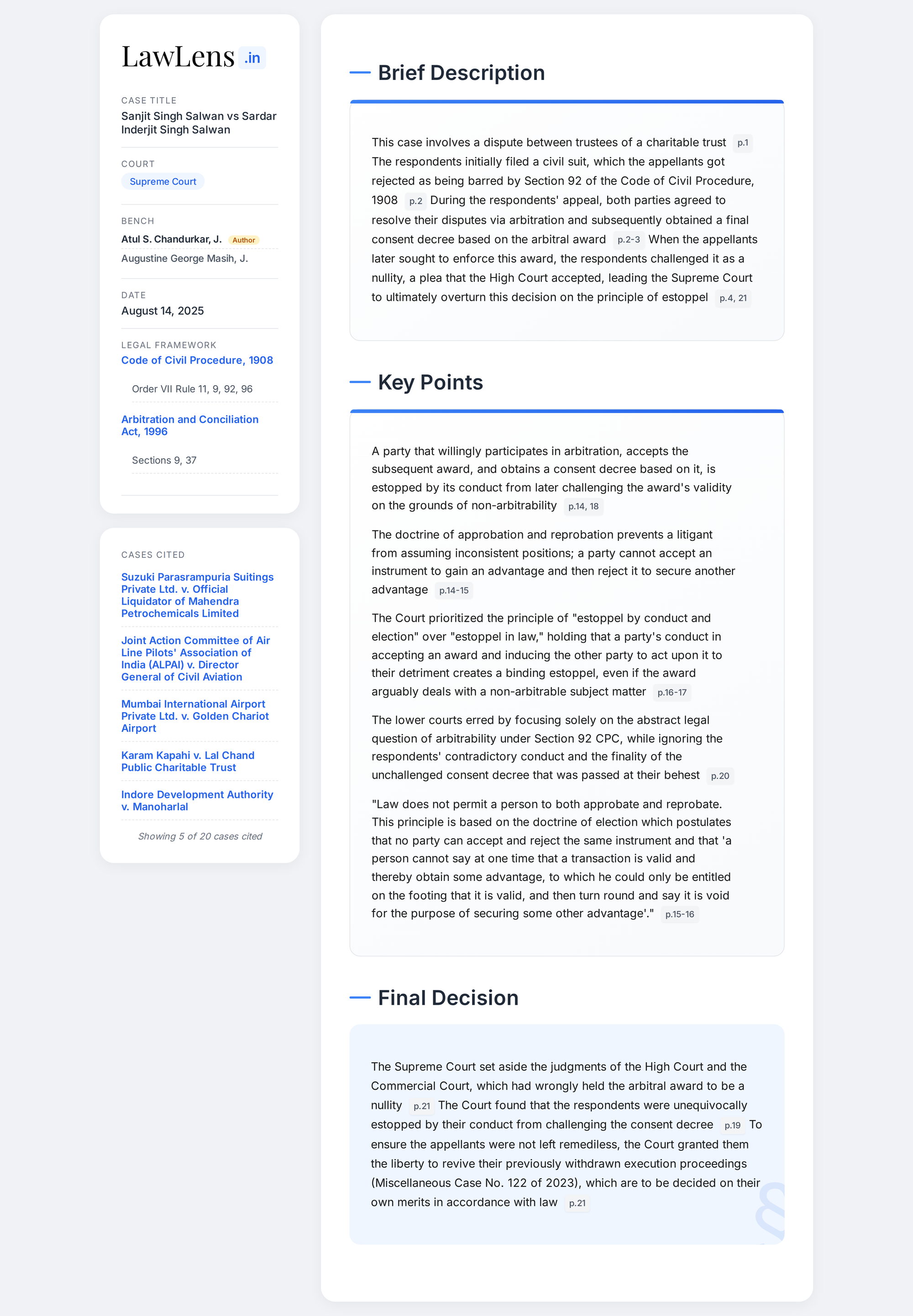 Estoppel In Law - Whether a plea of estoppel in law can be permitted to be raised by a party ignoring its conduct that resulted in the other party altering its position to its detriment in view of such conduct? In this case, the respondents initially filed a suit to restrain the appellants from interfering in the Trust’s school. The trial court dismissed the suit, but during appeal, both parties agreed to resolve their dispute through arbitration. The arbitrator’s award was accepted by both sides, and the appeal was disposed of as a consent decree based on this award-Later, the respondents challenged the validity of the arbitration award, arguing that such disputes were not arbitrable under Section 92 of the Code of Civil Procedure - Allowing appeal, SC observed: On the doctrine of estoppel by conduct and election the respondents cannot be permitted to now raise a plea that the compromise deed based on the award dated 30.12.2022 was a nullity in view of the provisions of Section 92 of the Code - The issue of invalidity of the award, as a question of law, cannot be considered de hors the conduct of parties. (Para 18-19)
