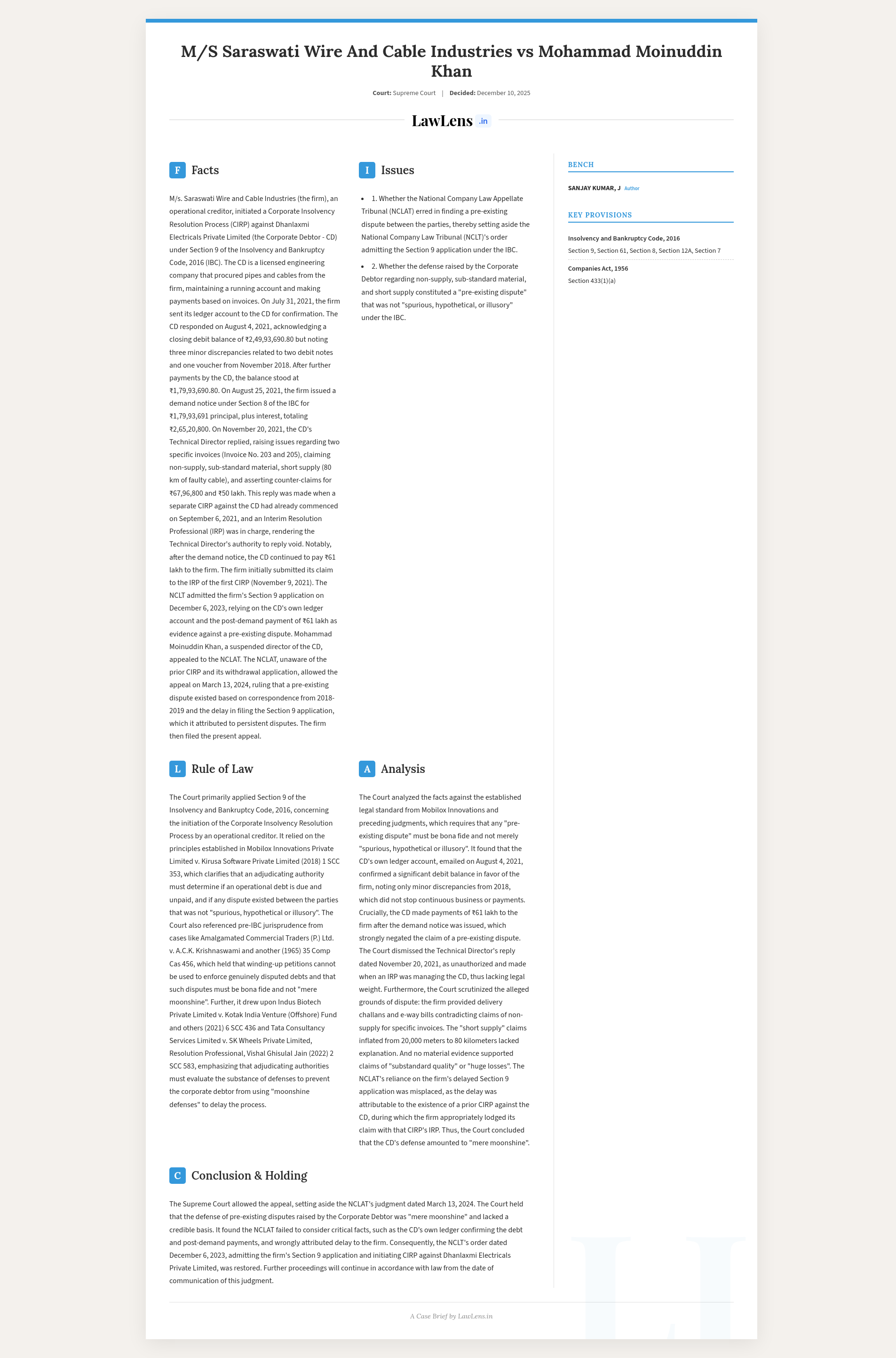 Saraswati Wire and Cable Industries v. Mohammad Moinuddin Khan 2025 INSC 1410 - S.7 IBC - Moonshine Defence