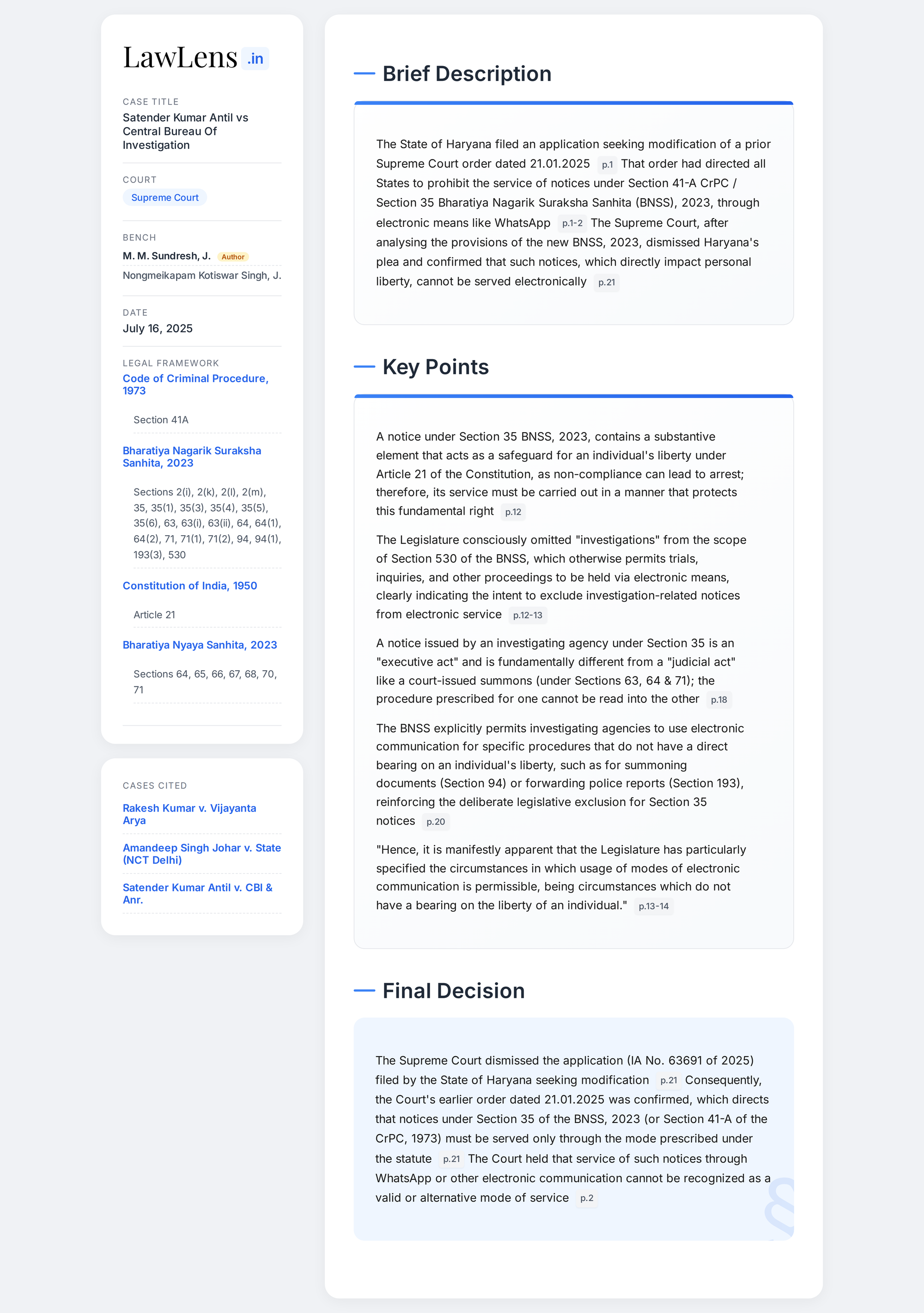 Satender Kumar Antil vs. Central Bureau of Investigation 2025 INSC 909 - S.35 Bharatiya Nagarik Suraksha Sanhita 2023 - Electronic Communication Of S.35 Notice
