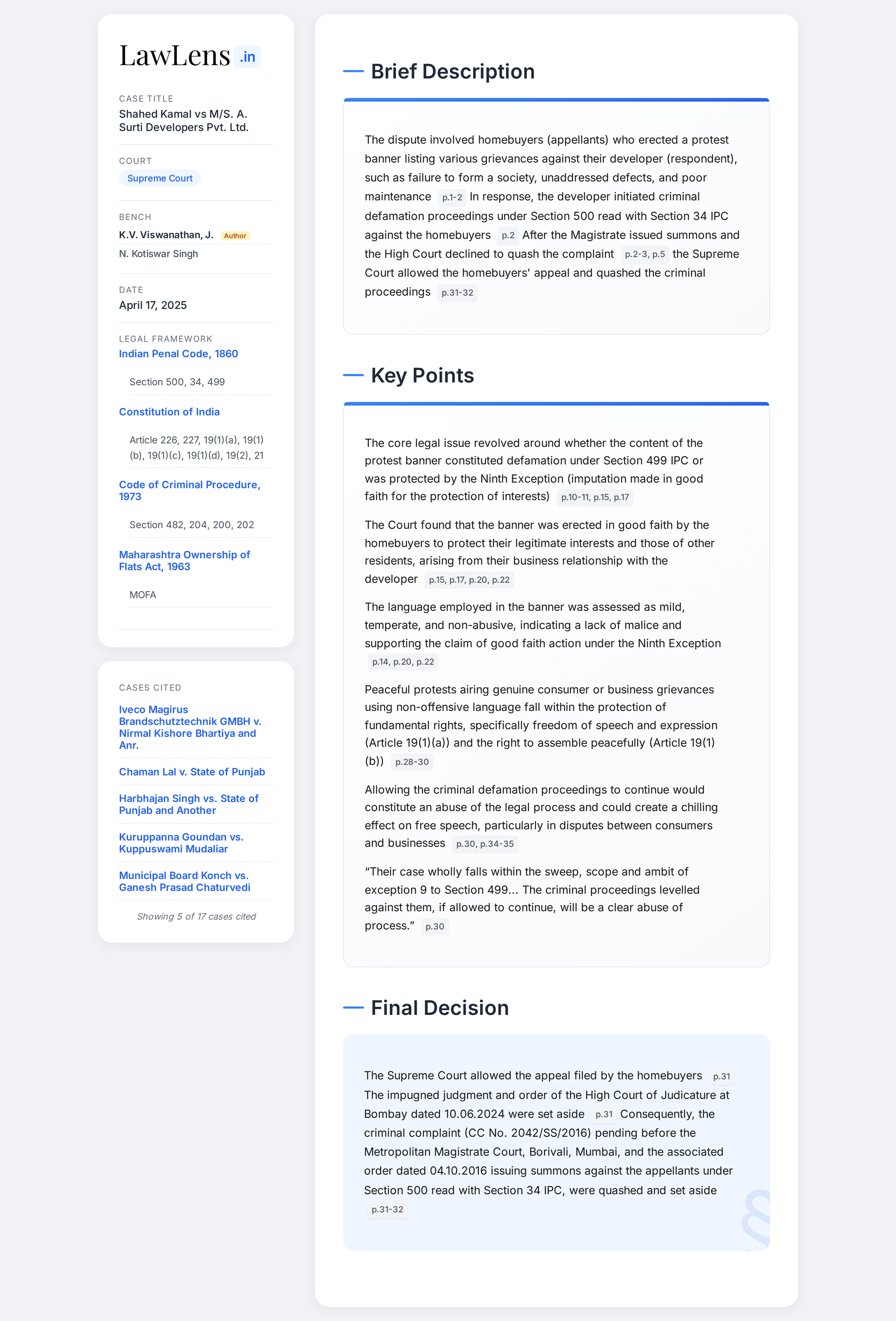 Shahed Kamal vs A. Surti Developers Pvt. Ltd. 2025 INSC 502 - S. 499 IPC - Defamation - Ninth Exception