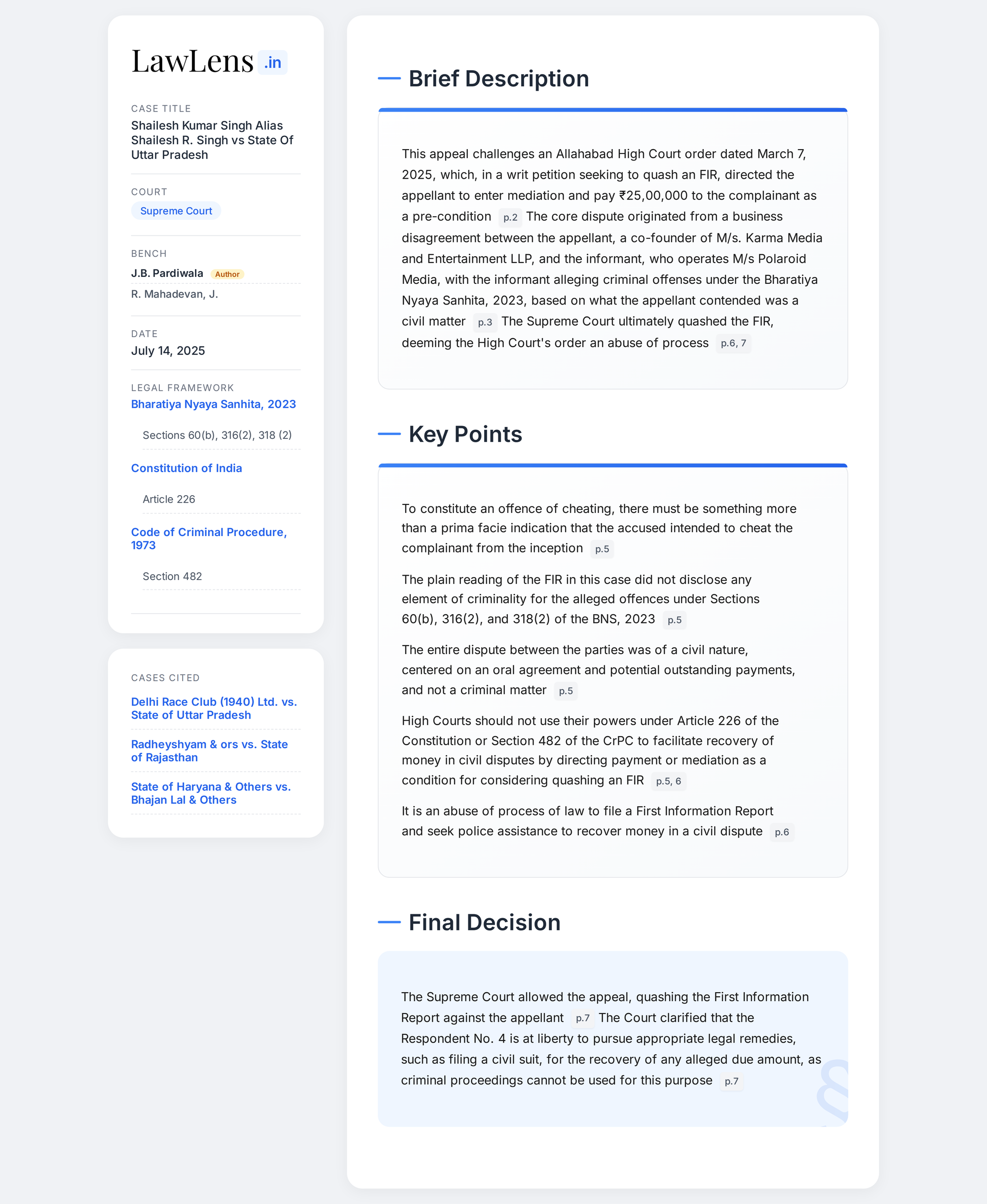 Shailesh Kumar Singh Alias Shailesh R. Singh vs State Of Uttar Pradesh 2025 INSC 869 - S.482 CrPC - Civil Disputes - Settlement