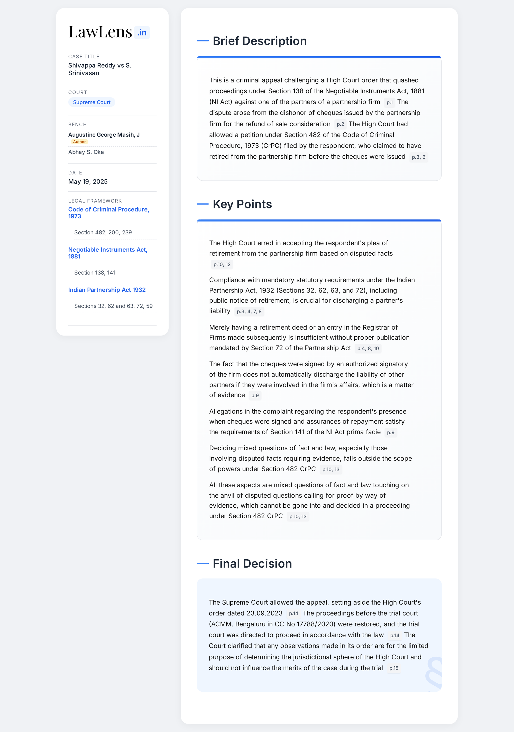 Indian Partnership Act 1932 - Section 63 - Merely putting forth a resignation or the partners entering into an agreement or drafting a deed or/and accepting the resignation of a partner of the Firm is insufficient for discharging the liability of a partner of the Firm unless a proper entry to the said effect after the publication has been given effect to with the same, having been recorded in the Register of Firms in the office of the Registrar of Firms as provided for in Section 63 of Partnership Act. (Para 10) [Context: Supreme Court restored criminal proceedings in a cheque bounce case ]