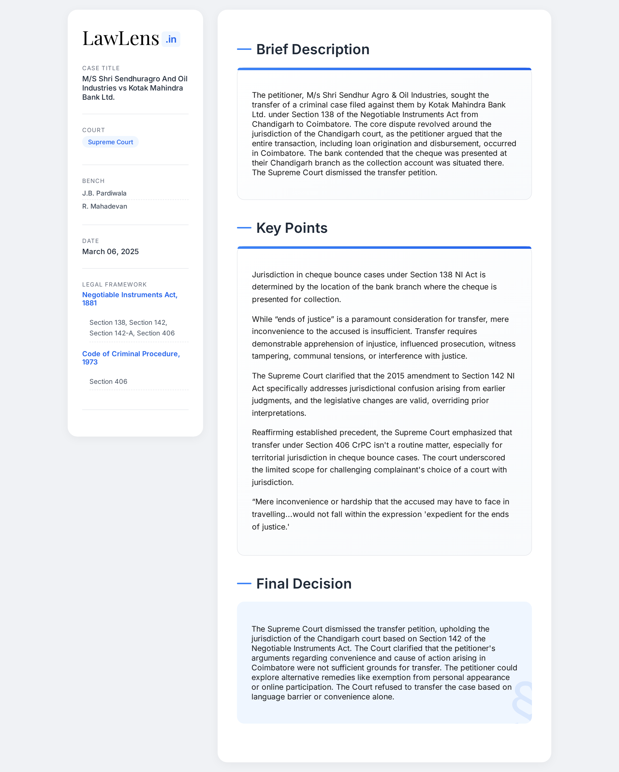 Code Of Criminal Procedure 1973 - Section 406 ; Negotiable Instruments Act 1881 - Section 138, 142- Section 142 of the N.I. Act in clear terms, provides the complainant with the right to lodge a complaint, before a court, within whose jurisdiction, the branch of the bank where the cheque is delivered for collection, is situated. Therefore, the argument that another court might also be empowered to take cognizance of the matter under Section 142, since the cause of action arose within that jurisdiction, cannot by itself be a ground for seeking transfer under Section 406 of the Cr.P.C. (Para 55)