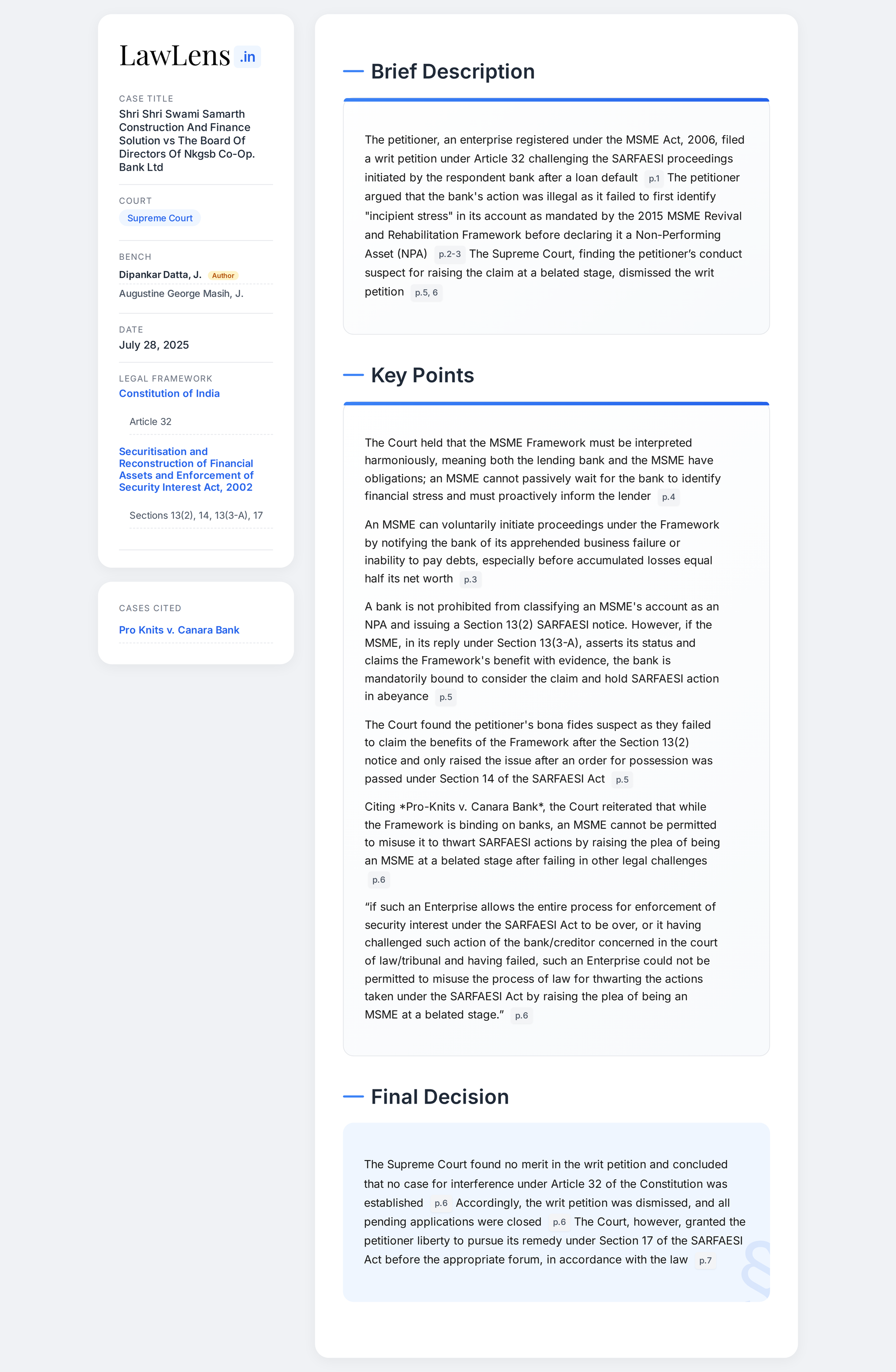 Shri Shri Swami Samarth Construction & Finance Solution vs Board of Directors of NKGSB Co-op. Bank Ltd. 2025 INSC 908 - SARFAESI Act - MSMED Act