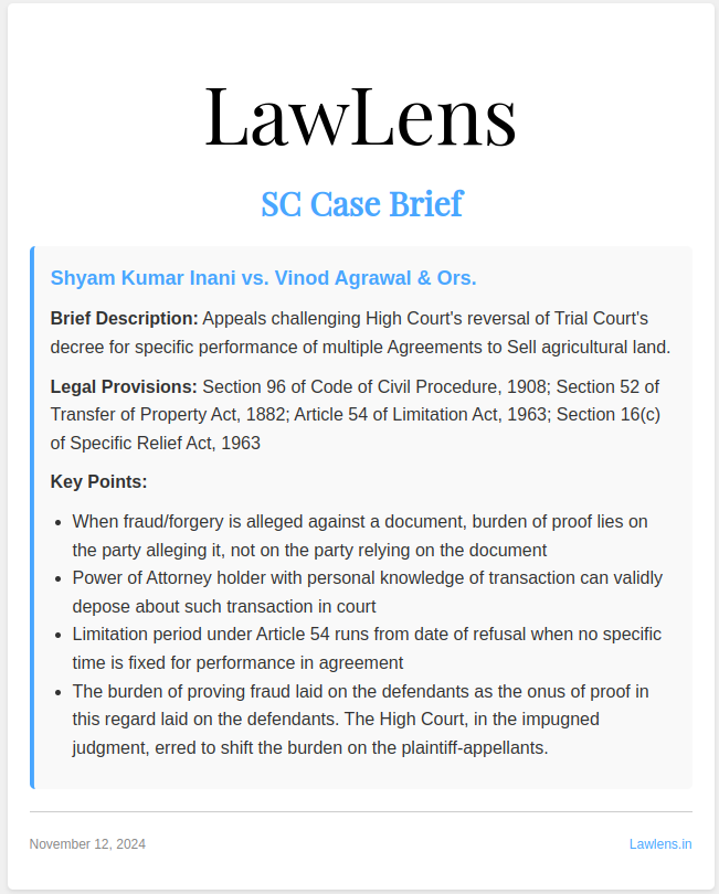 Shyam Kumar Inani vs Vinod Agrawal 2024 INSC 865 - Limitation Act - Sale Agreement