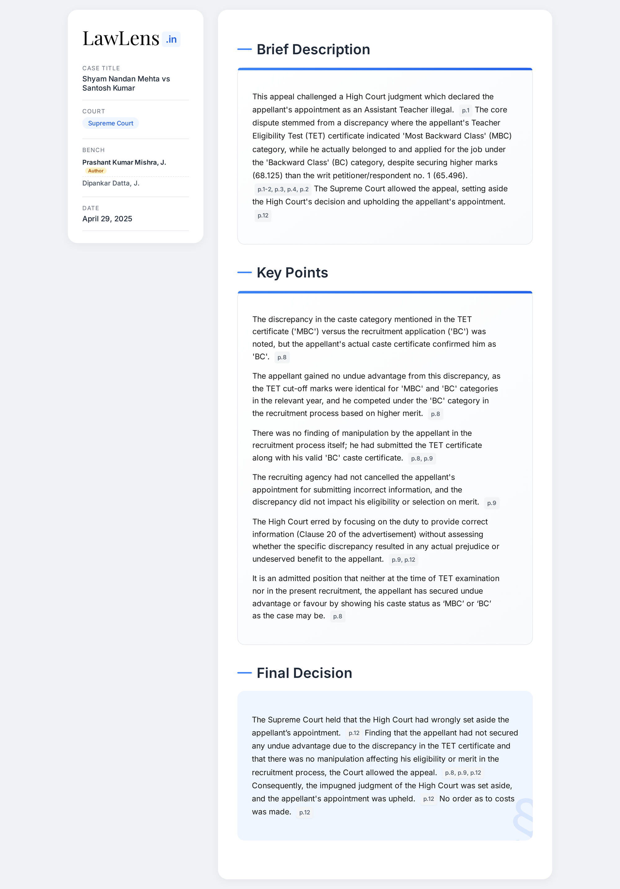 Shyam Nandan Mehta vs Santosh Kumar 2025 INSC 586 - Writ Petition -Illegal Appointment - Incorrect Information