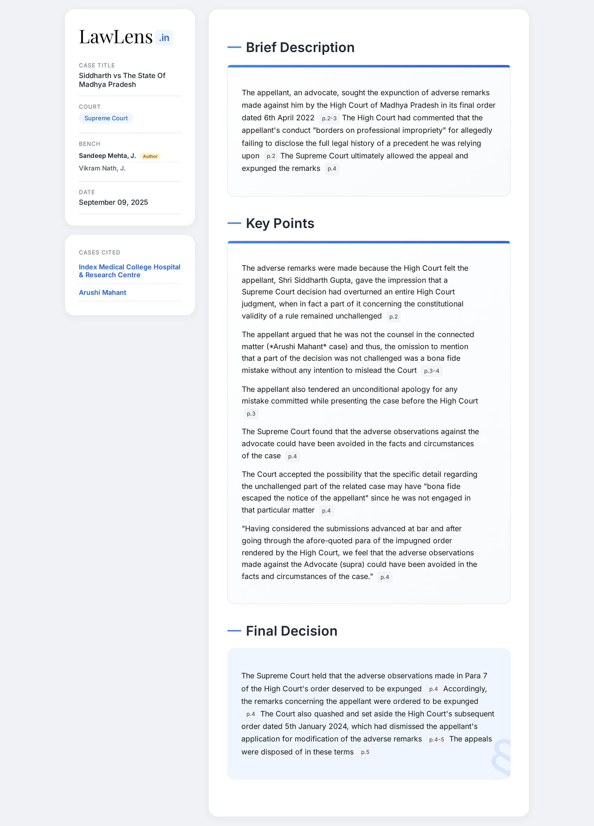Siddharth vs State of Madhya Pradesh 2025 INSC 1082 - Adverse Remarks Against Advocate Quashed