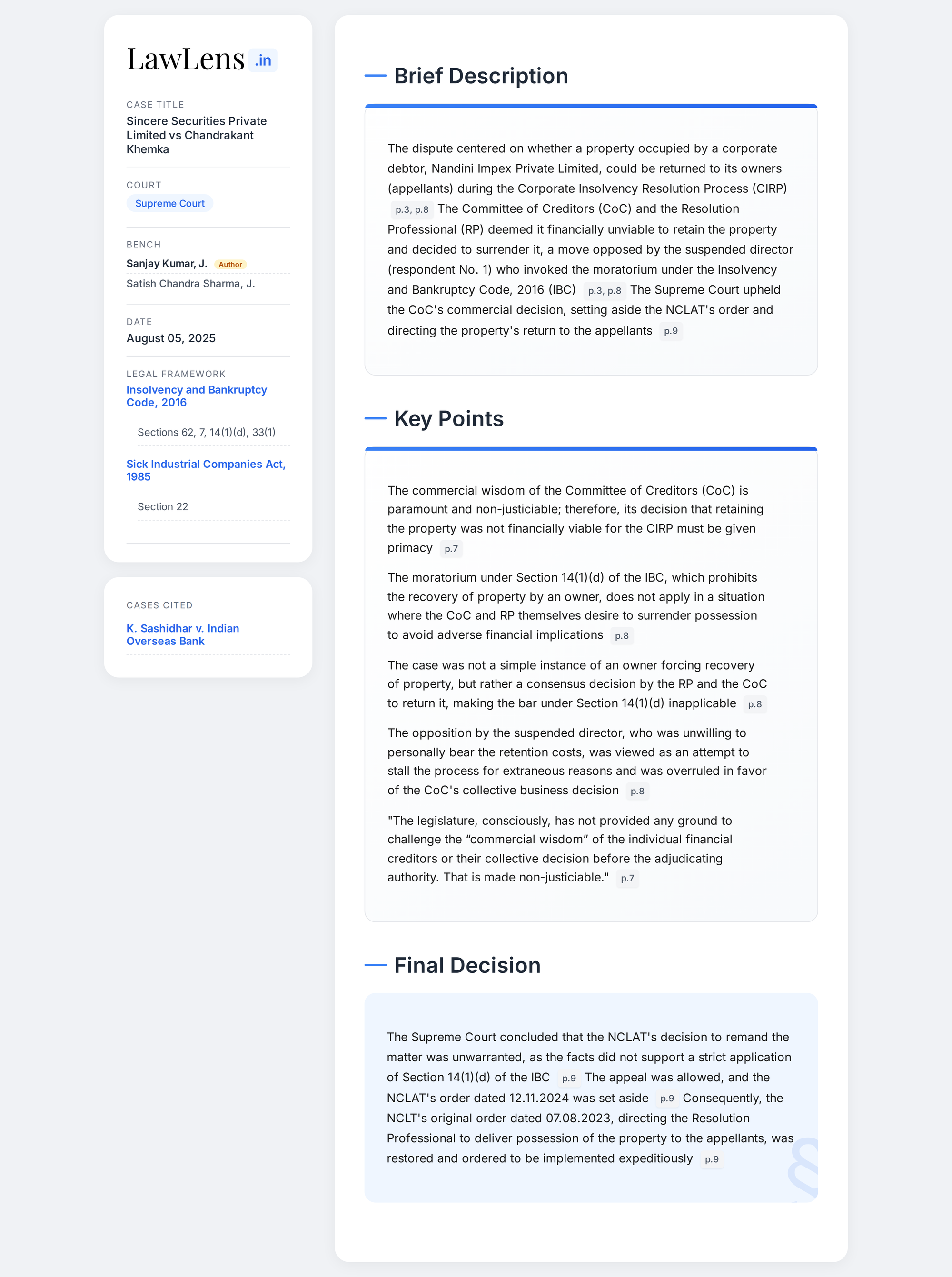 Sincere Securities Private Limited & Ors. v. Chandrakant Khemka 2025 INSC 931 - IBC - CoC - Commercial Wisdom