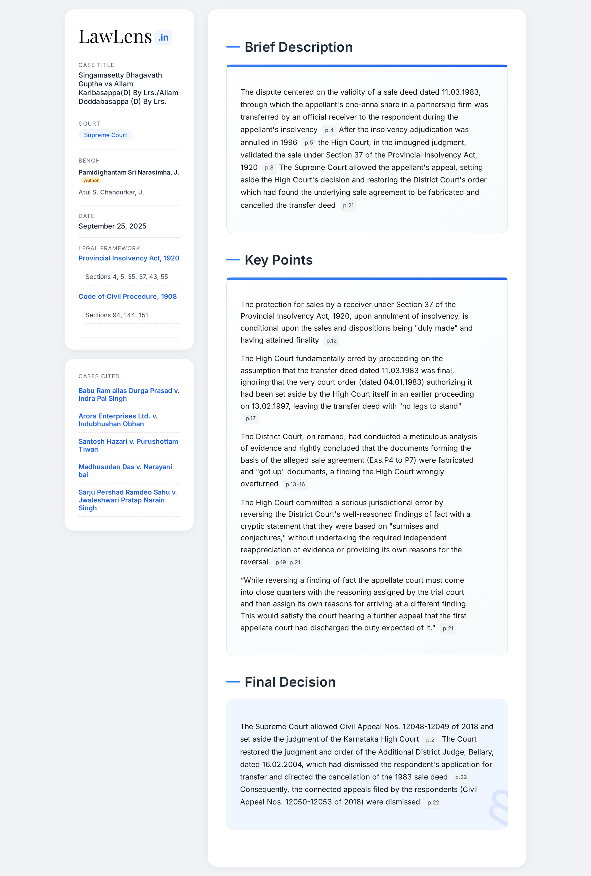 Singamasetty Bhagavath Guptha v. Allam Karibasappa (D) 2025 INSC 1159 - CPC - First Appeal - Provincial Insolvency Act