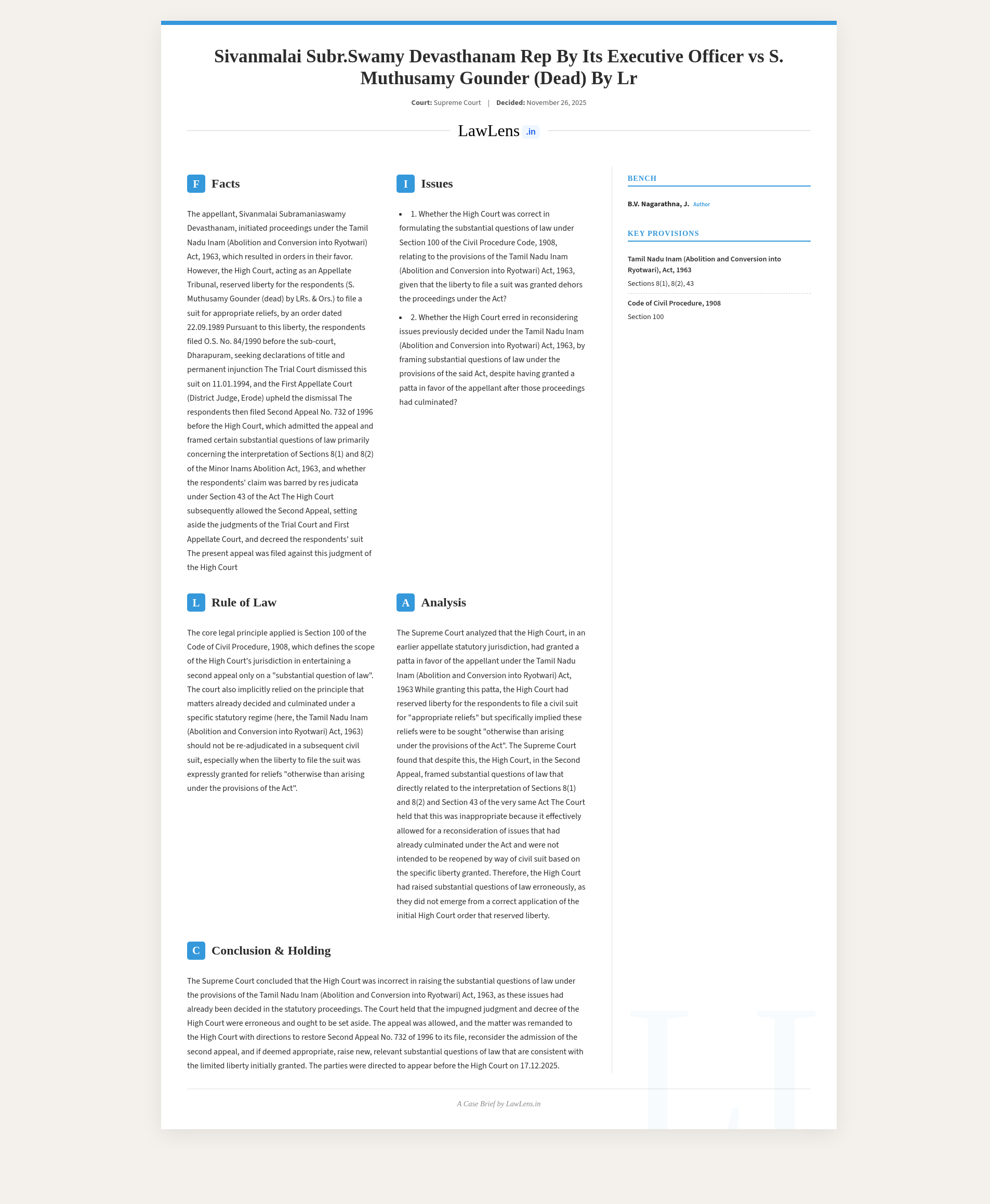 - Case Name: Sivanmalai Subramaniaswamy Devasthanam Rep. by its Executive Officer vs S. Muthusamy Gounder (Dead) by LRs. & Ors.