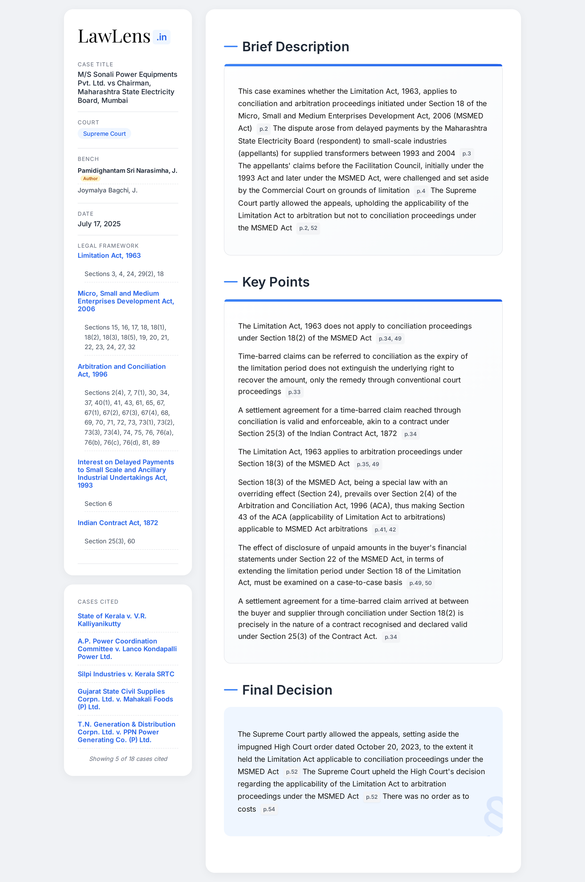 Sonali Power Equipments Pvt. Ltd vs Chairman, Maharashtra State Electricity Board, Mumbai 2025 INSC 864- Conciliation & Arbitration Under MSMED Act - Applicability Of Limitation Act