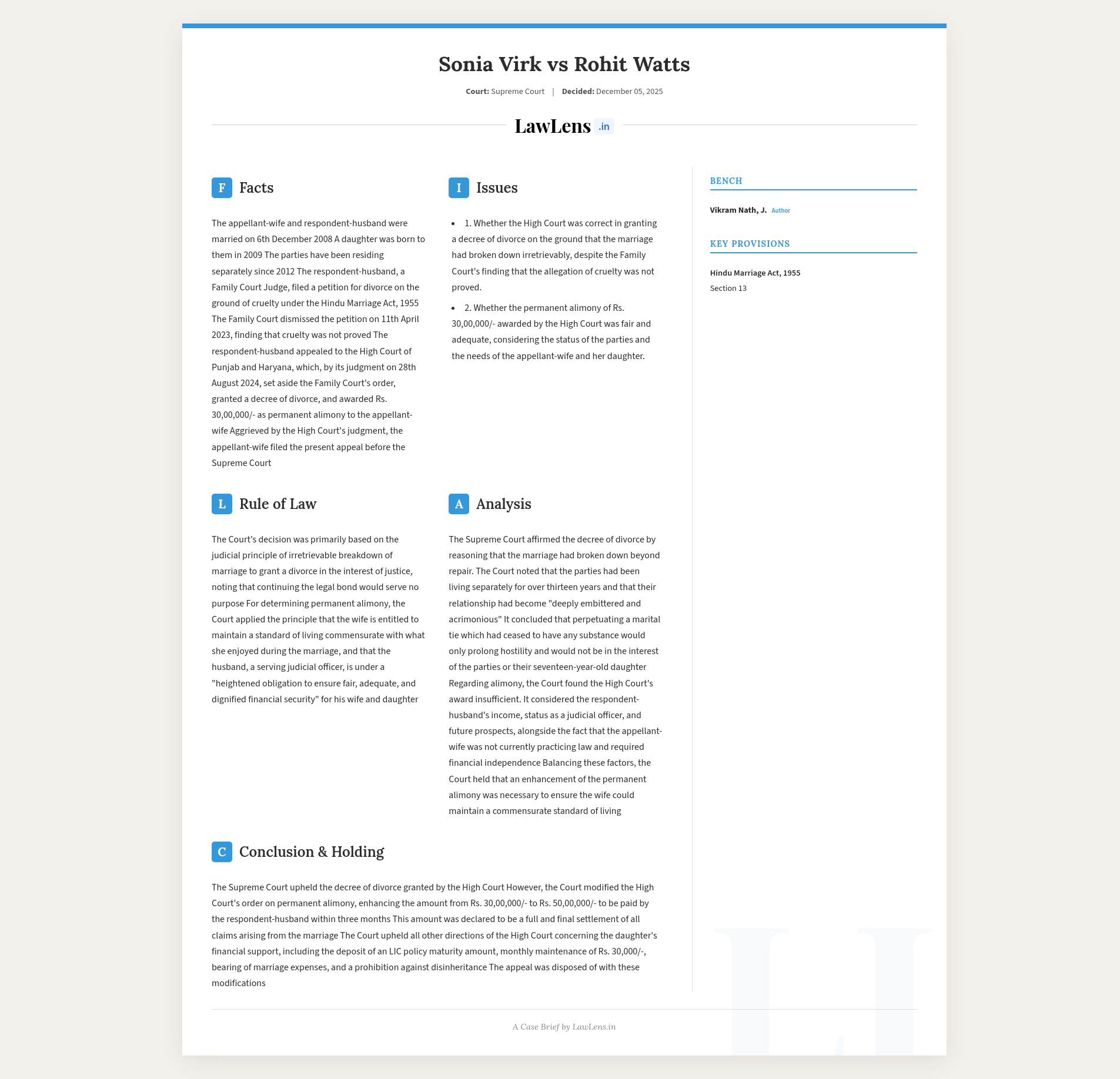 Sonia Virk vs Rohit Vats; 2025 INSC 1390 - Irretrievable Breakdown Of Marriage - Permanent Alimony - Judicial Officer Husband