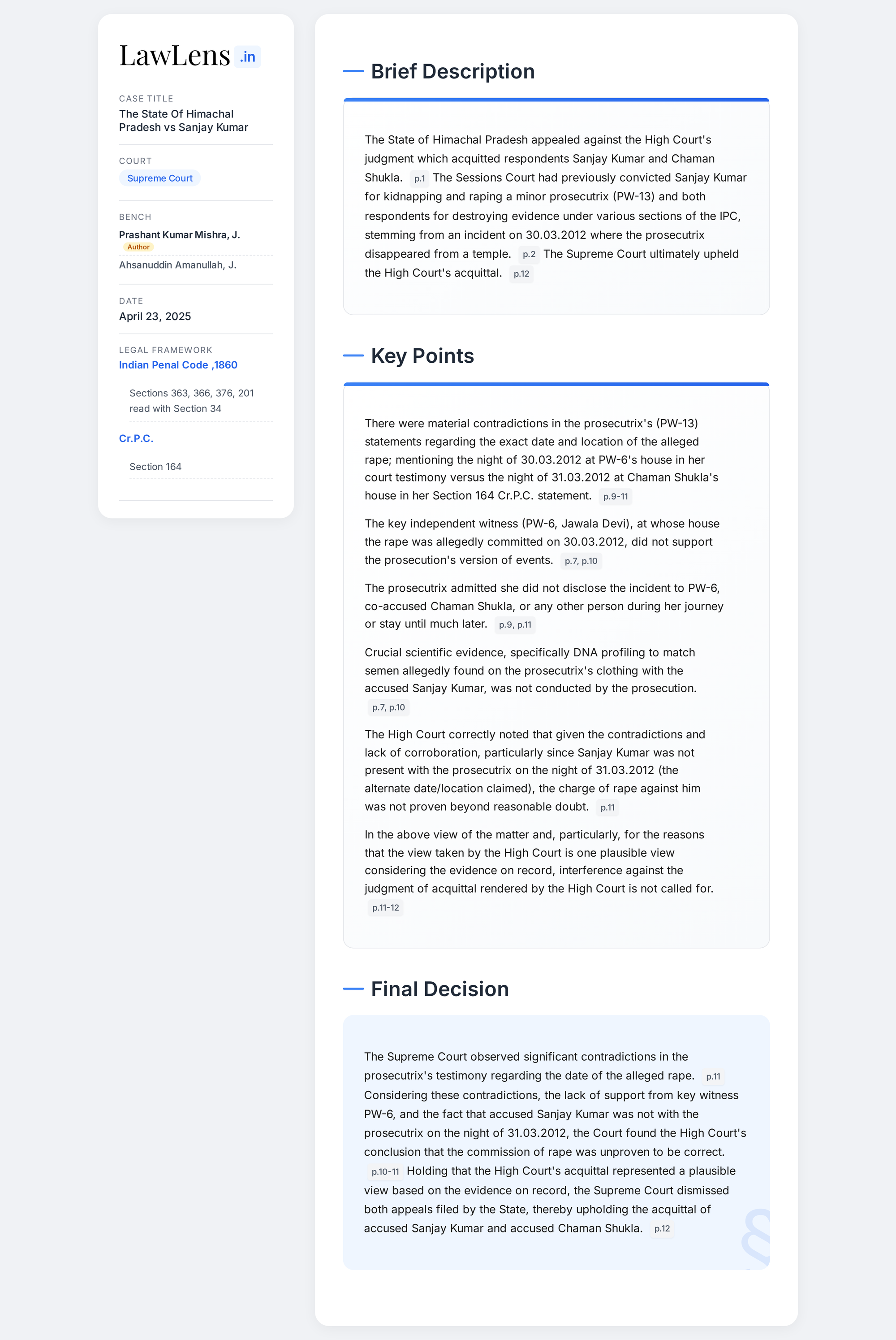State Of Himachal Pradesh vs Sanjay Kumar 2025 INSC 561 - Rape Case - Acquittal