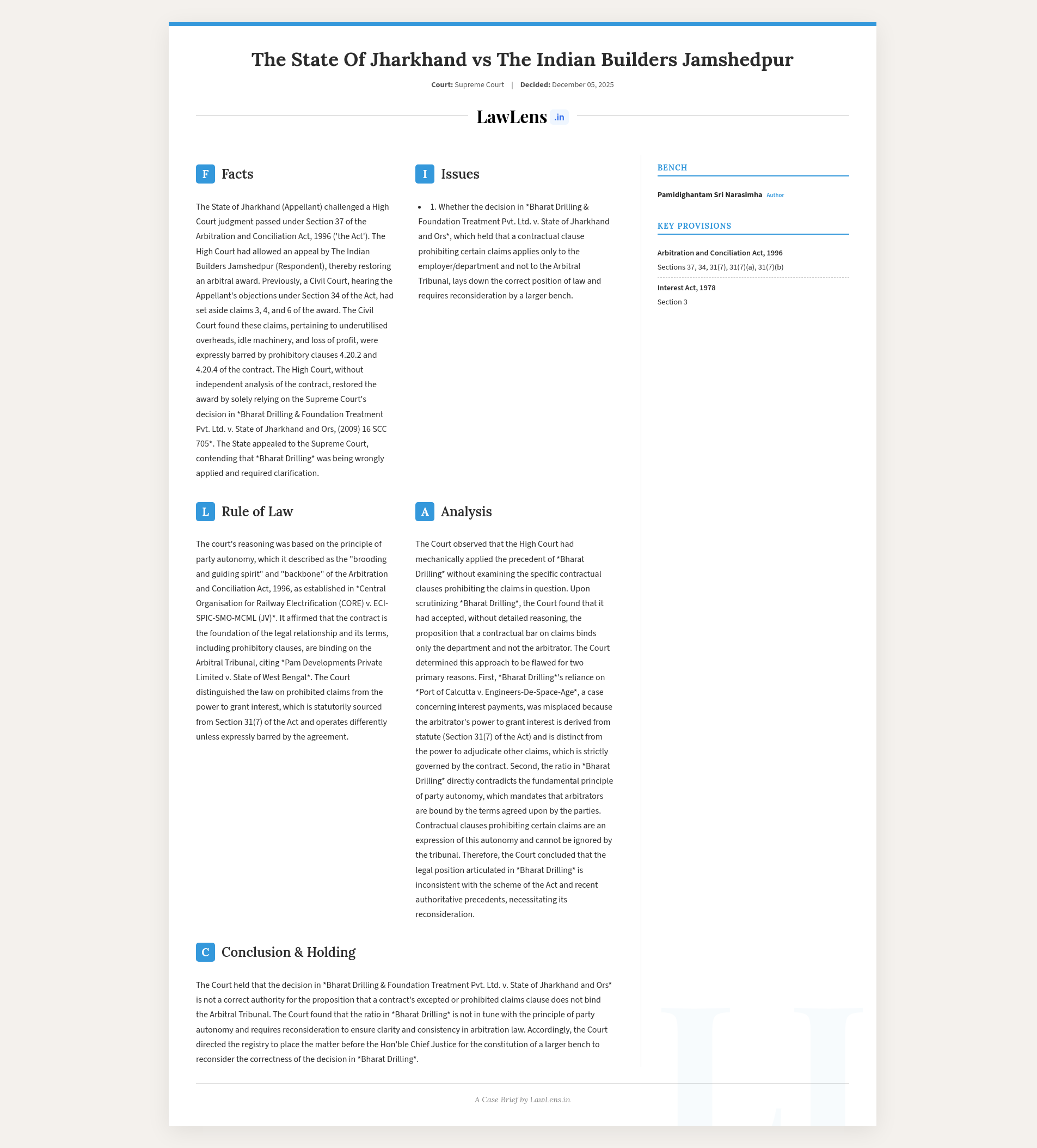 State of Jharkhand v. The Indian Builders Jamshedpur; 2025 INSC 1388 - Bharat Drilling - Referred To Larger Bench - Excepted Or Prohibitory Clauses