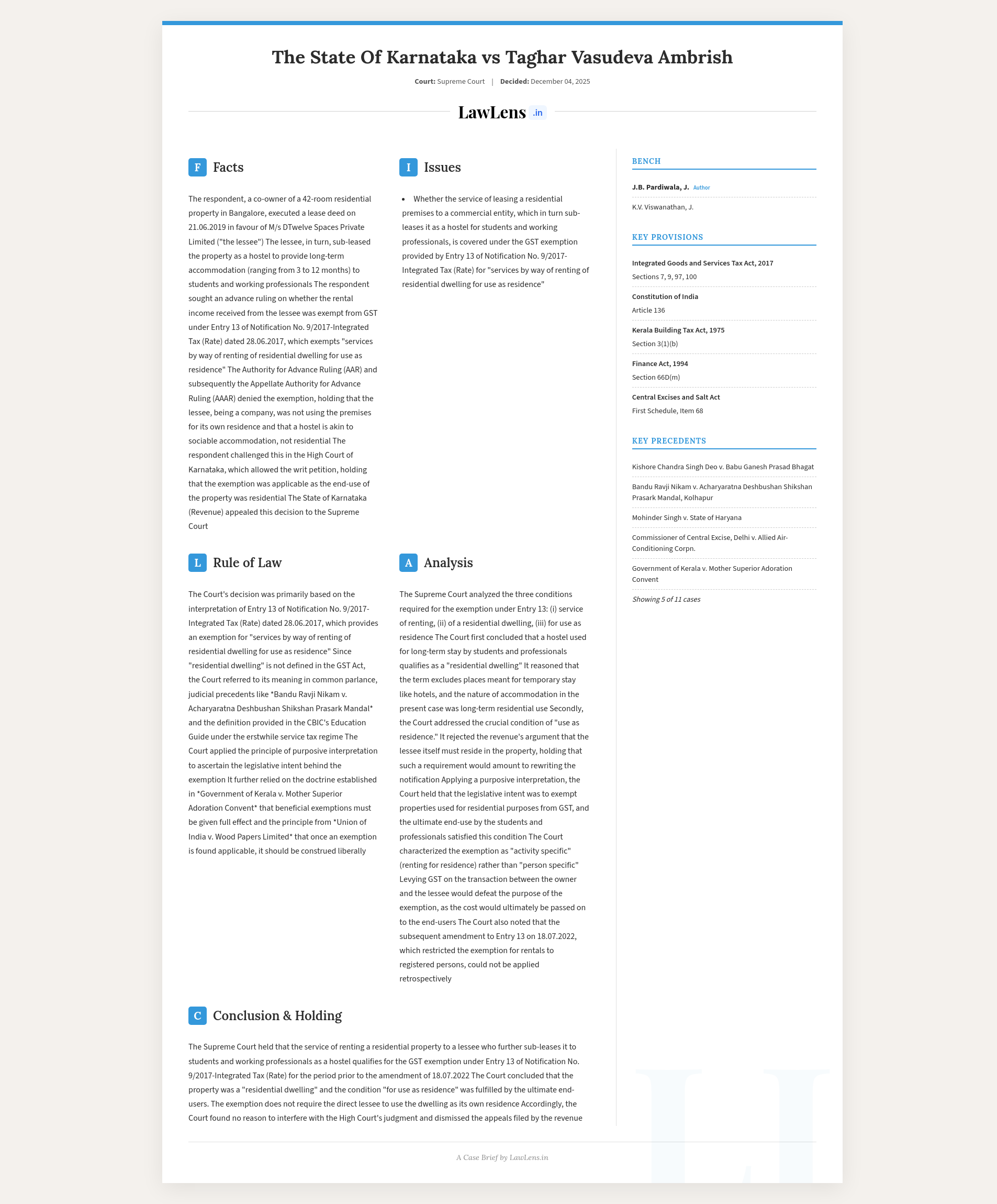 Integrated Goods and Services Tax Act, 2017 -Notification No. 9/2017- Integrated Tax (Rate) dated 28.06.2017 -Entry No. 13 - Authority for Advance Ruling, Karnataka held that the services provided in the form of leasing of residential premises as hostel to students and working professionals does not fall within the ambit of Entry 13 - High Court set aside AAAR order- Dismissing appeal, Supreme Court observed: Unconditional exemption was provided to renting of a residential dwelling to any person when the same is used for residence- GST is payable in the case of renting of a residential dwelling to any person when the same is used for the commercial purpose - Any residential accommodation meant for long term stay can be referred to as “residential dwelling”- Entry 13 of the Exemption Notification does not mandate that the lessee must use the residential dwelling as its own residence -Exemption is extended to cases wherein residential dwelling is rented out and ultimately used as residence, irrespective of the person using it (Para 61). Even if the rent is paid by a registered person, the exemption will be available if it is used for the purpose of own residence and is rented in the personal capacity. Therefore, the intention from the beginning was to ensure that rental agreements for use of the property for residential purposes are granted exemption from GST. (Para 68)