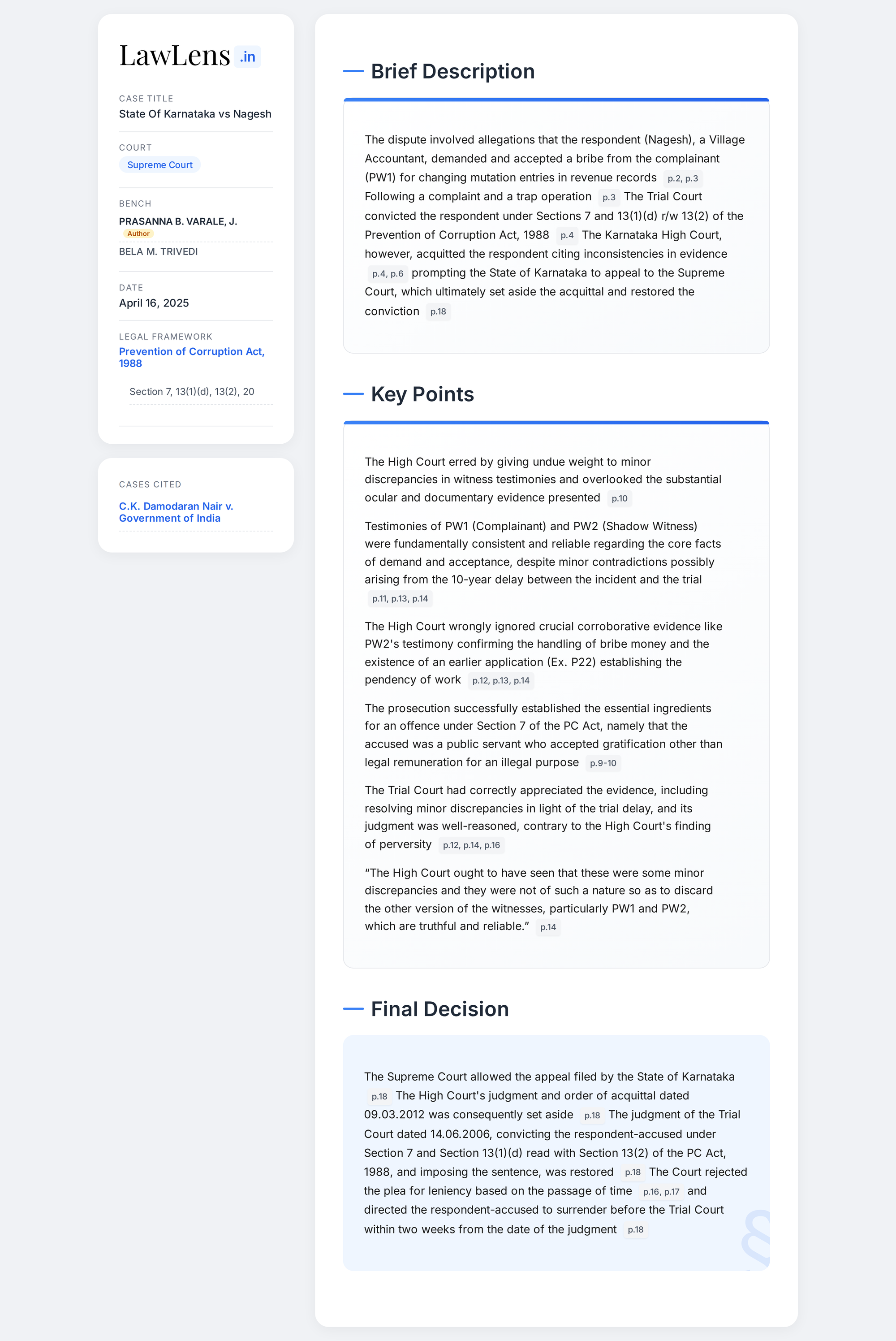 State Of Karnataka vs Nagesh 2025 INSC 492 - S. 7 PC Act - Corruption